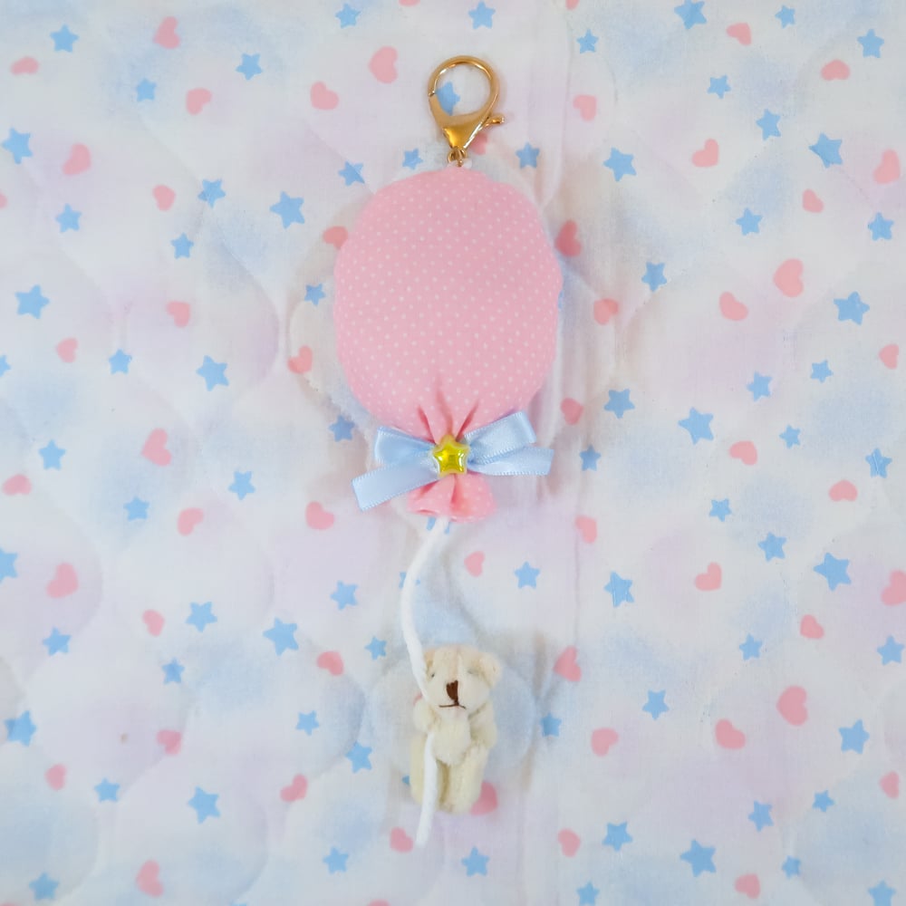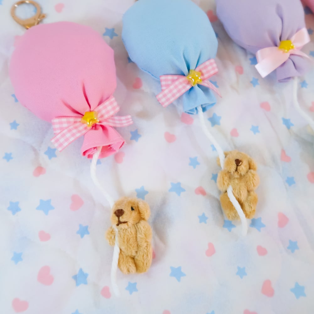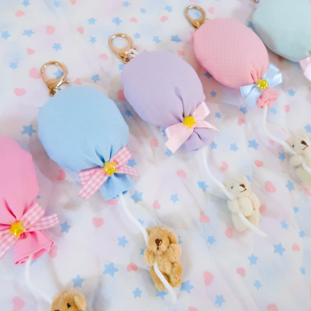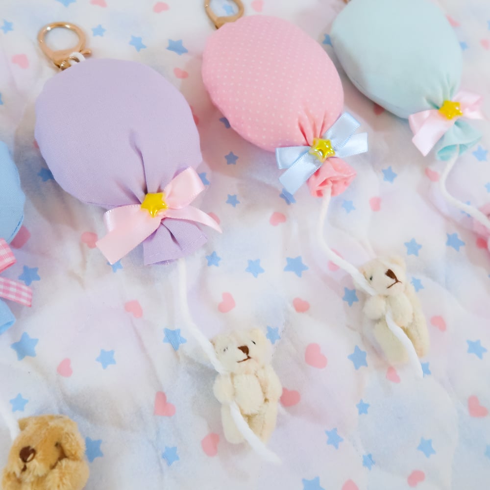 A plush balloon keychain with a mini teddy bear hanging on~! Each balloon has a bow and star on the center~