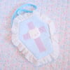 A coffin shaped bag with a cross and a soft embroidered bear on the front~ The cross and coffin feature ruffled lace on the edges~
