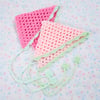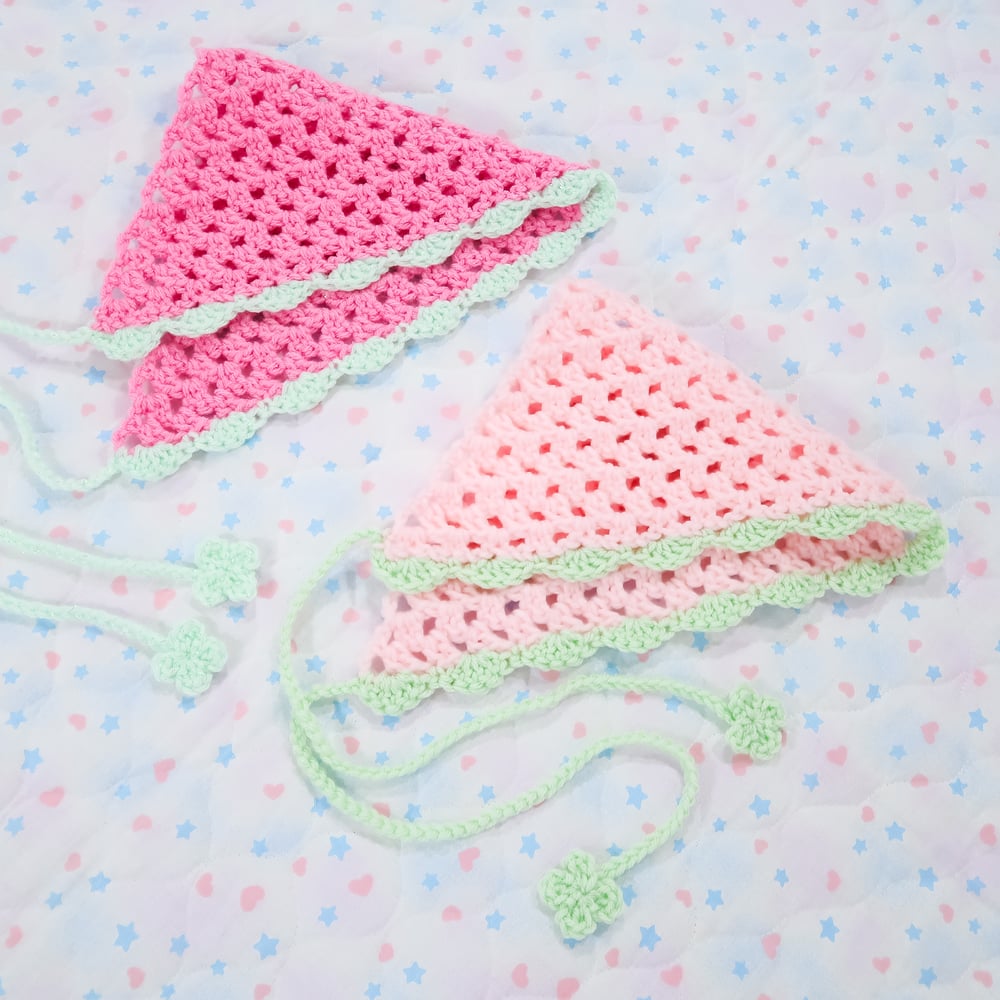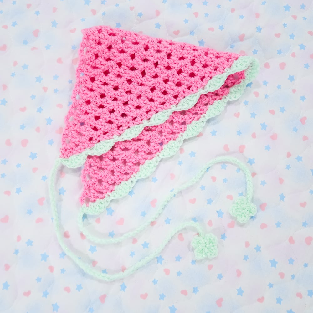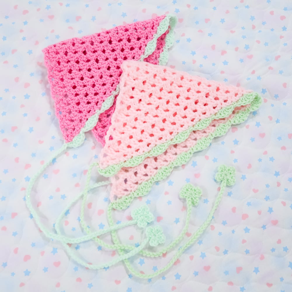 A crocheted bandana headdress with strawberry themed colors~ The green ties also have little clovers on each end~