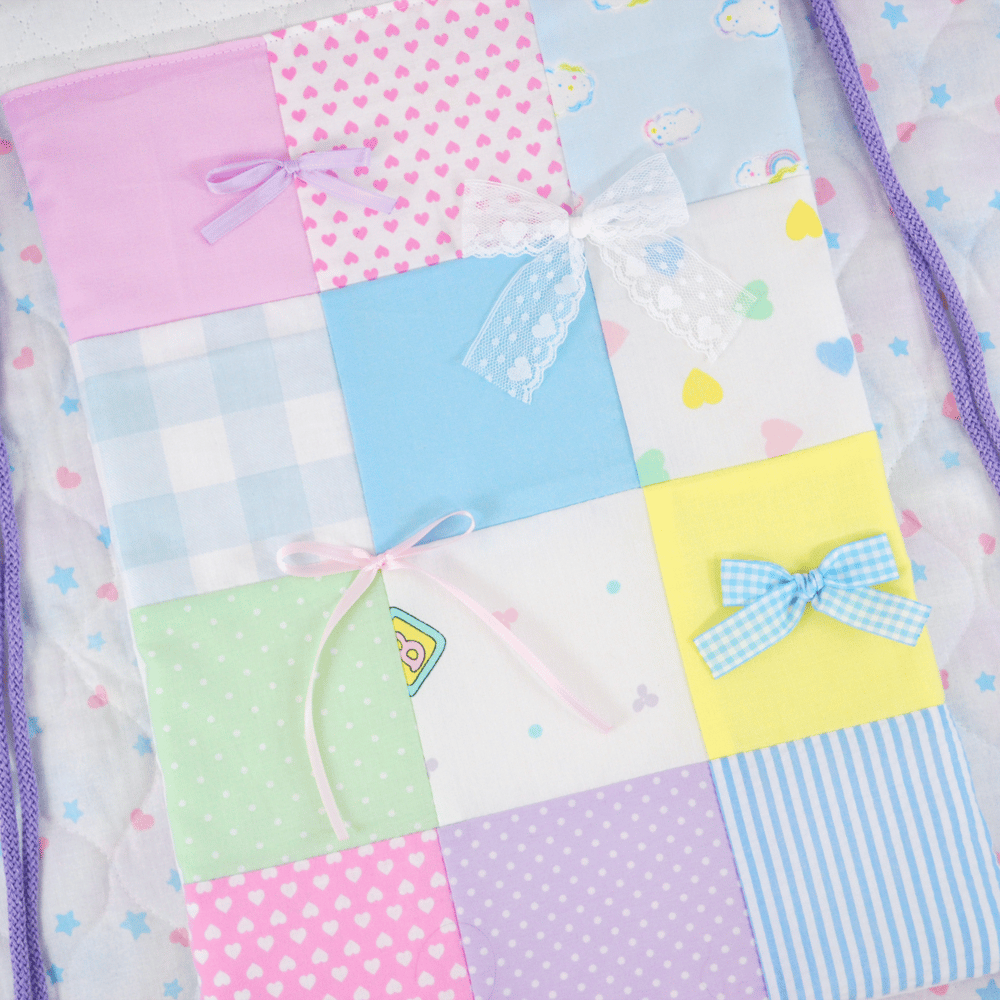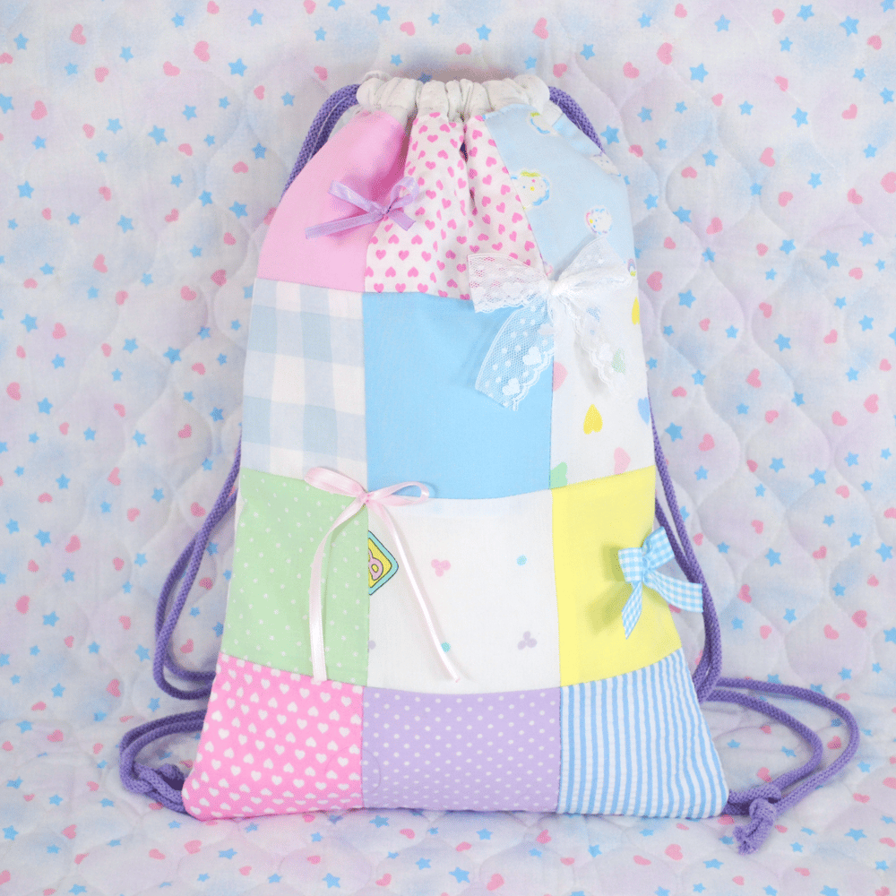 A quilted drawstring bag made from a mixture of new and vintage fabrics from Japan and the US~ It also features drawstring cord made from recycled textile yarn!