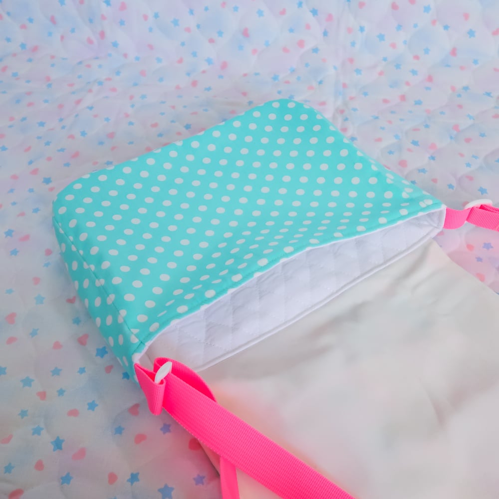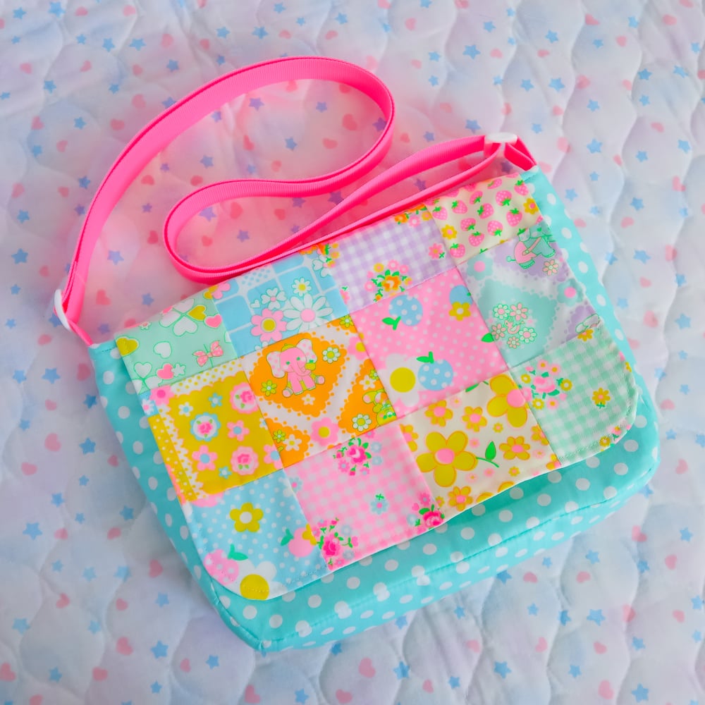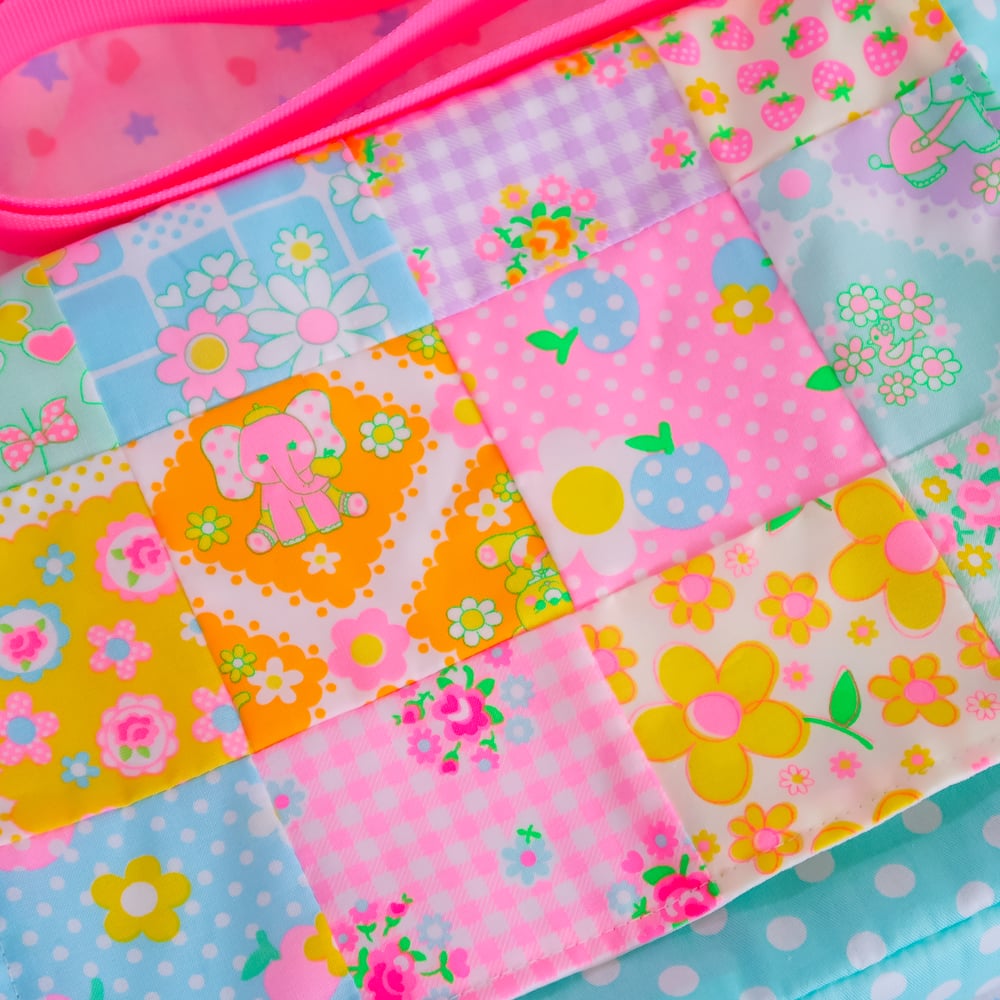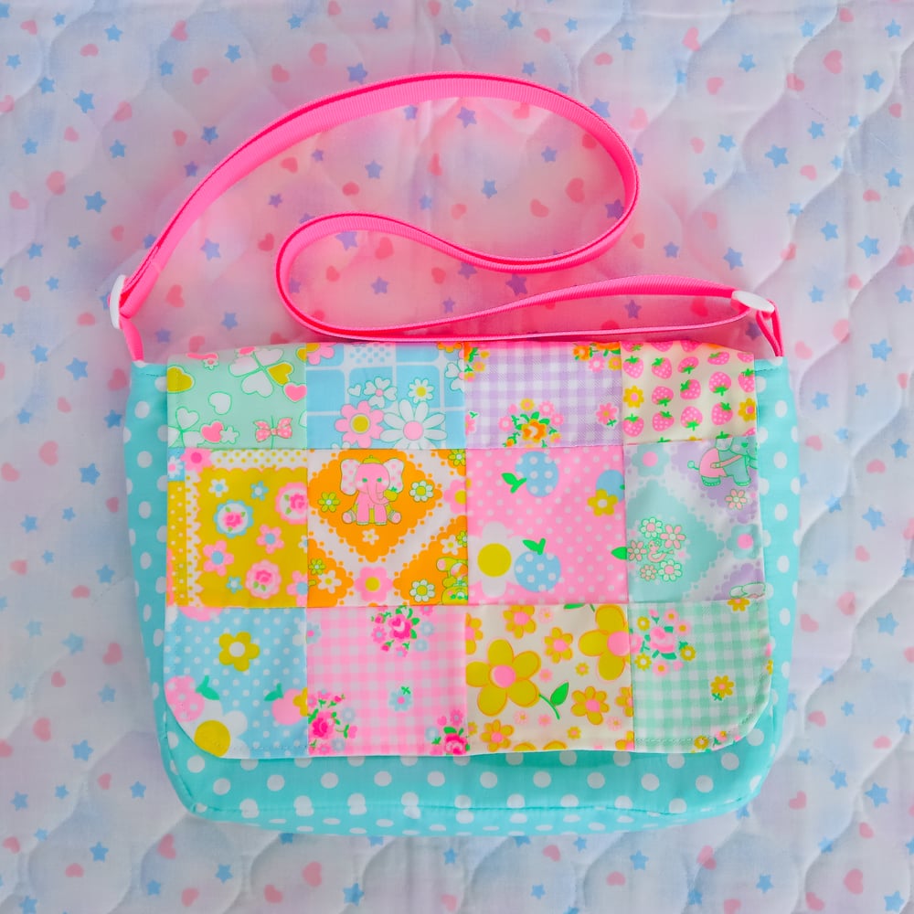 A shoulder bag made from a polka dot patterned fabric. It also features a quilted flap with different kinds of patterned fabrics. The shoulder strap's length can also be adjusted using the side buckle~