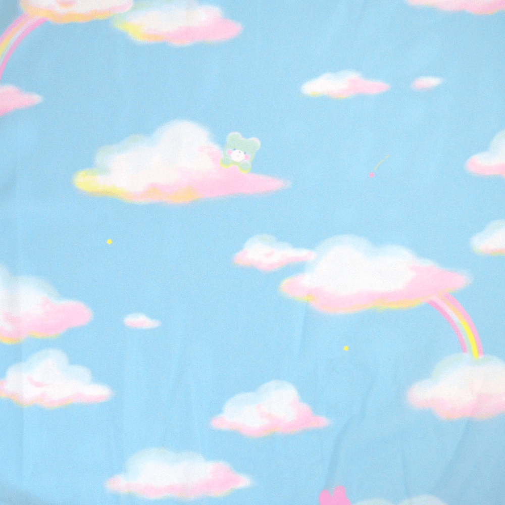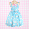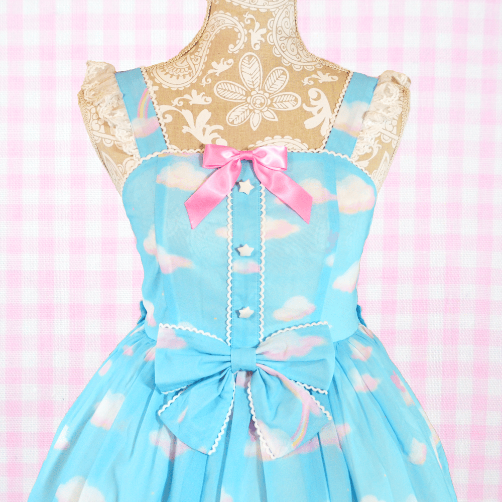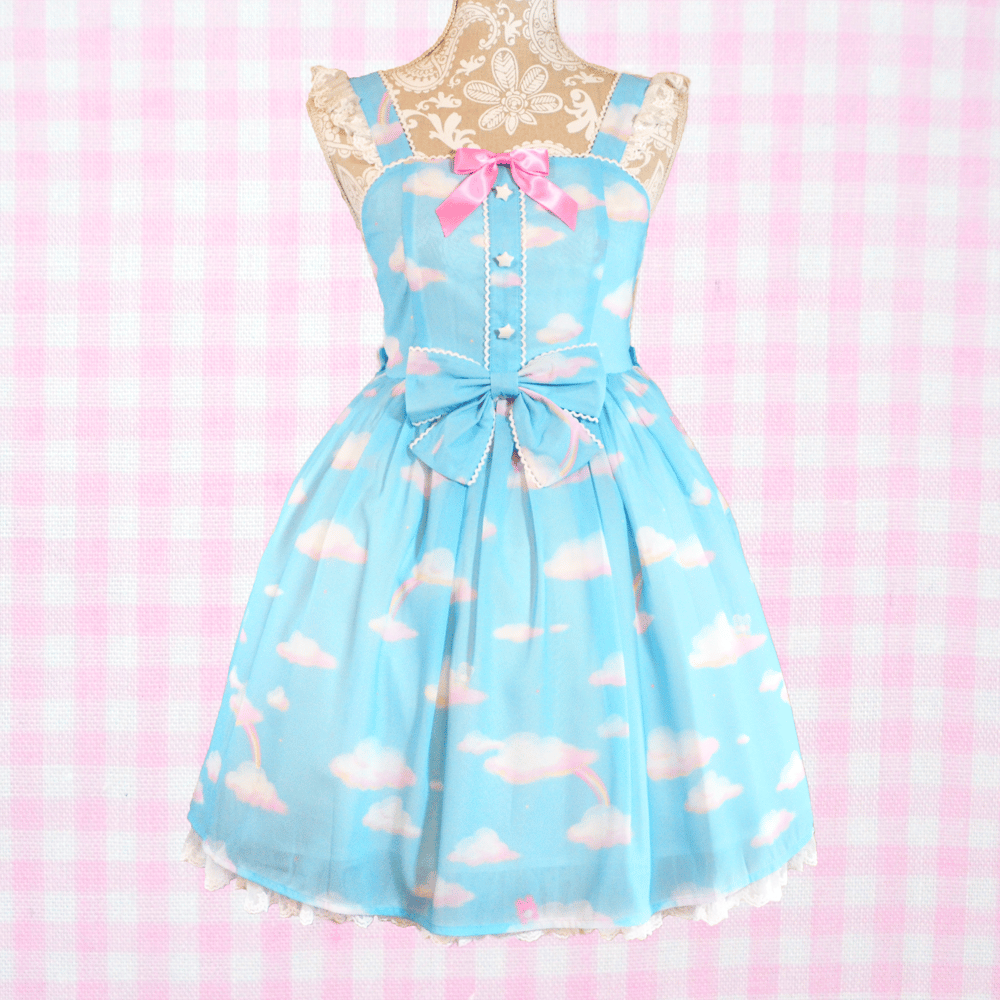 A super dreamy print of a blue bear and pink bunny in some comfy clouds and rainbows along with small stars sprinkled throughout the print~ The white lace on this dress also features cute stars to compliment the print~!