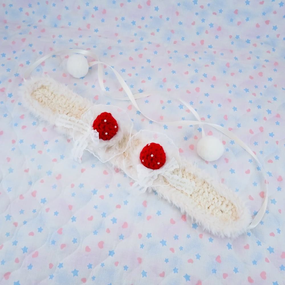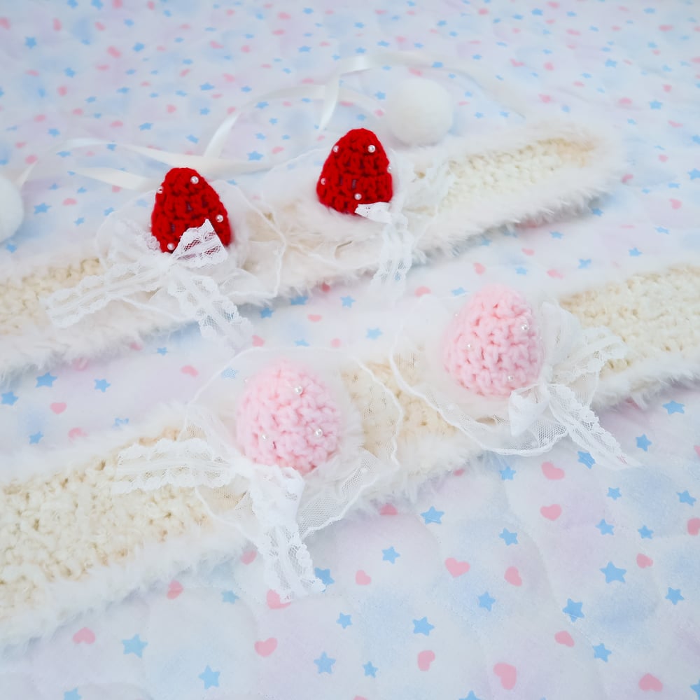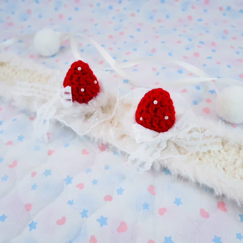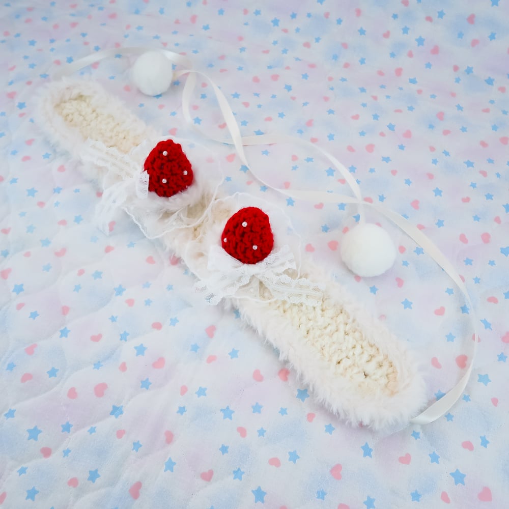 A crocheted headdress with strawberries inspired by the very sweet pokemon, Alcremie. The edges of the headdress feature soft faux fur around the edges and lace around each strawberry. Each strawberry is also accented with pearl beads, a lace bow and faux fur. On each side of the headdress, there are satin straps with faux fur pom poms to tie the headdress on~
