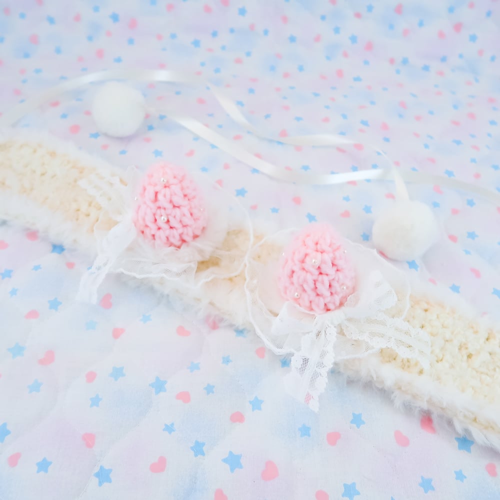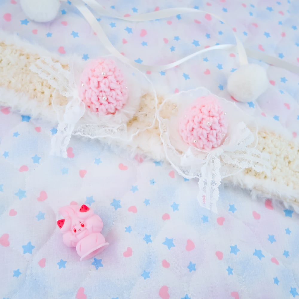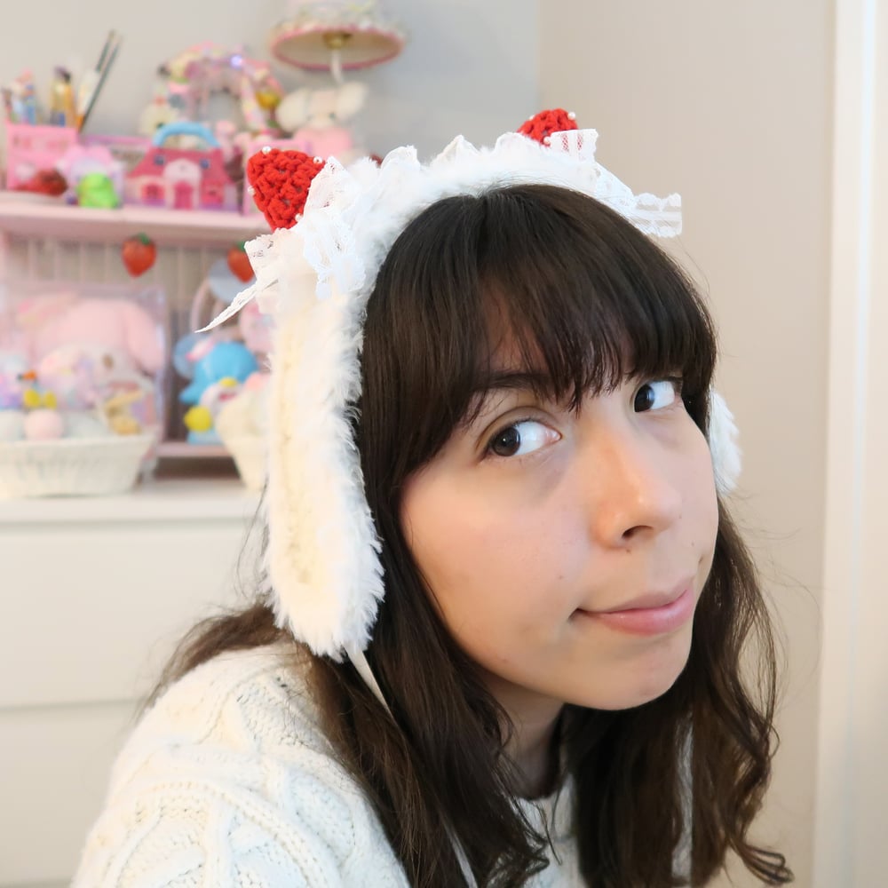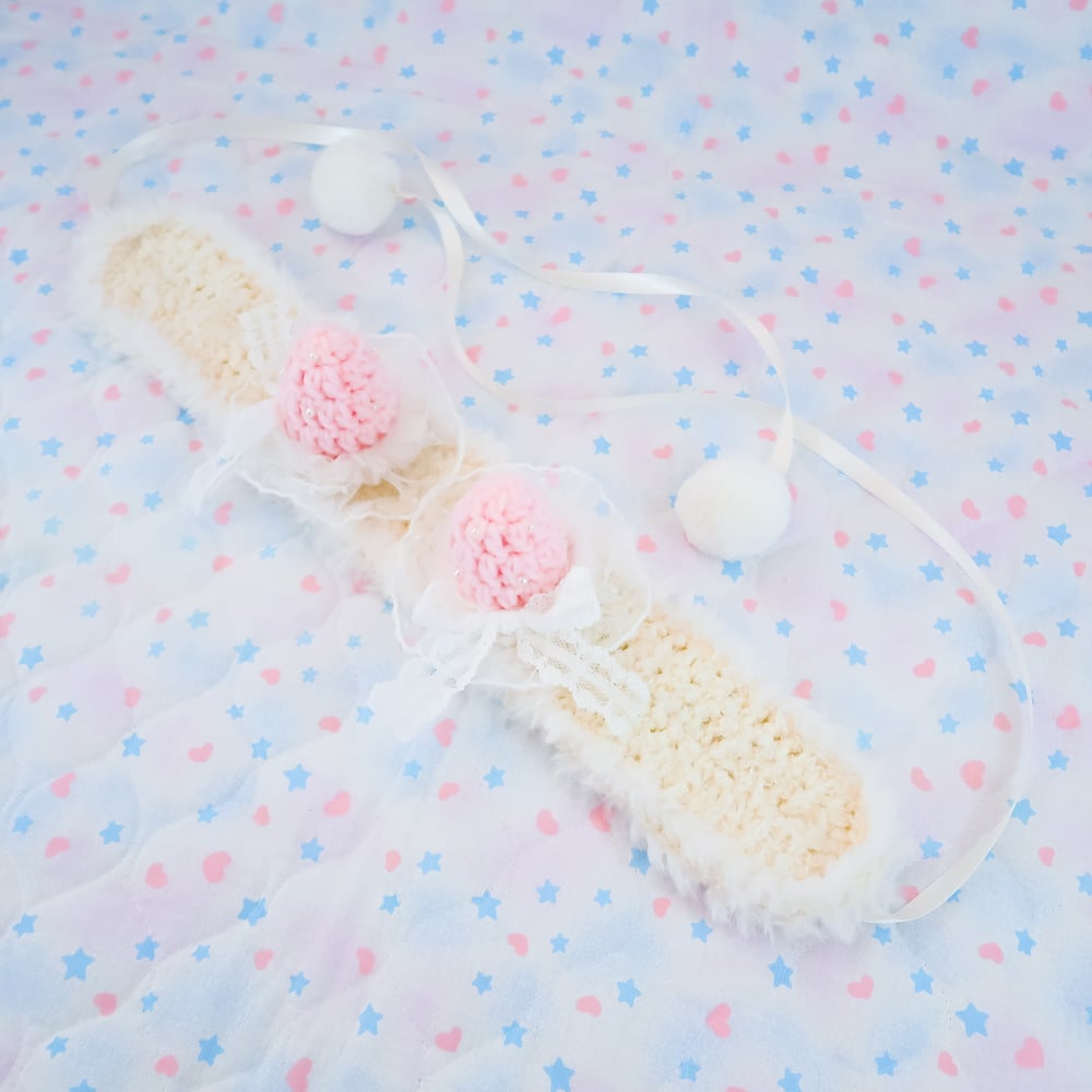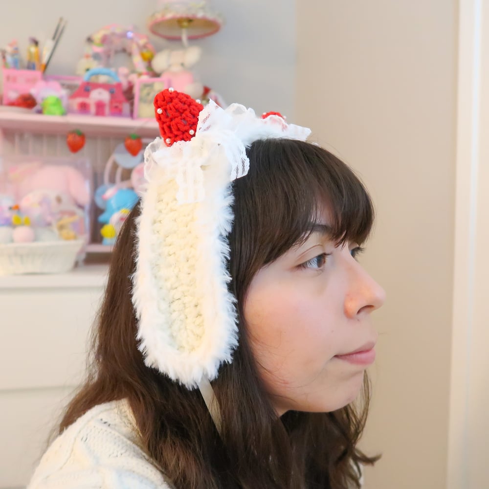 A crocheted headdress with strawberries inspired by the very sweet pokemon, Alcremie. The edges of the headdress feature soft faux fur around the edges and lace around each strawberry. Each strawberry is also accented with pearl beads, a lace bow and faux fur. On each side of the headdress, there are satin straps with faux fur pom poms to tie the headdress on~