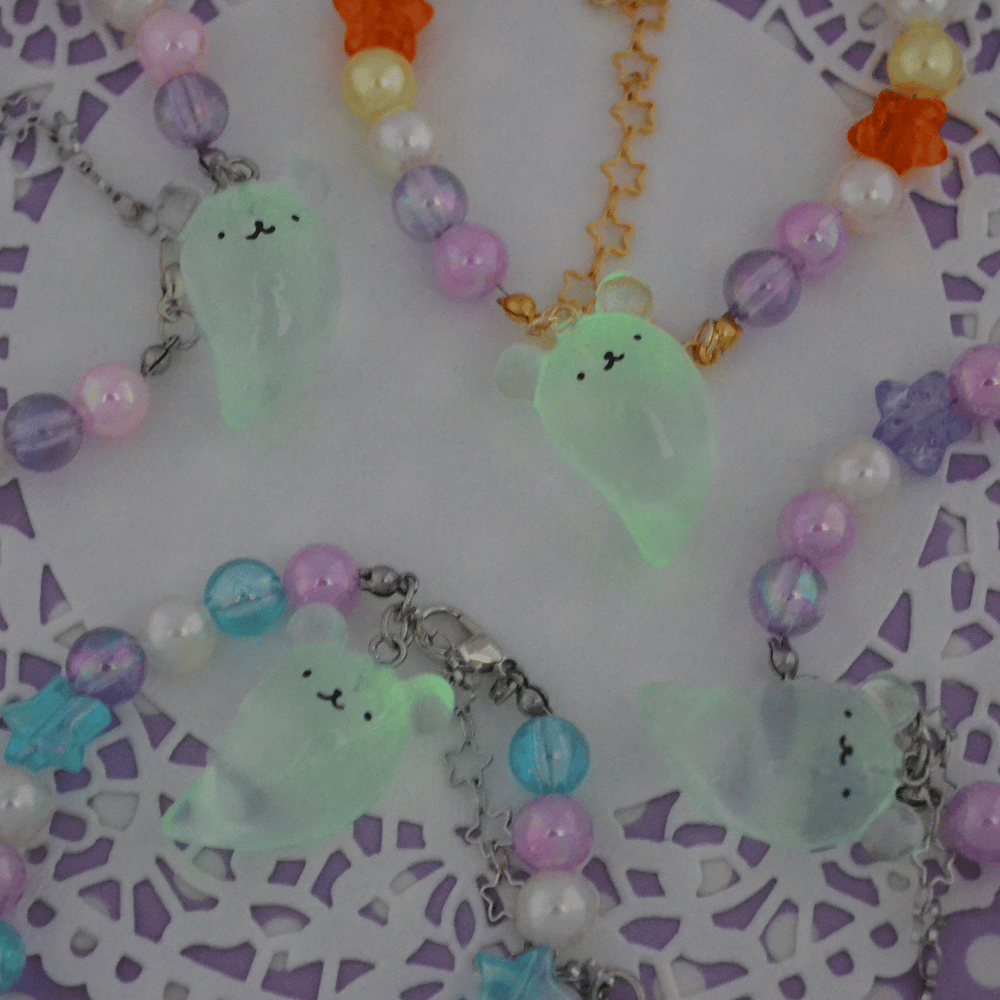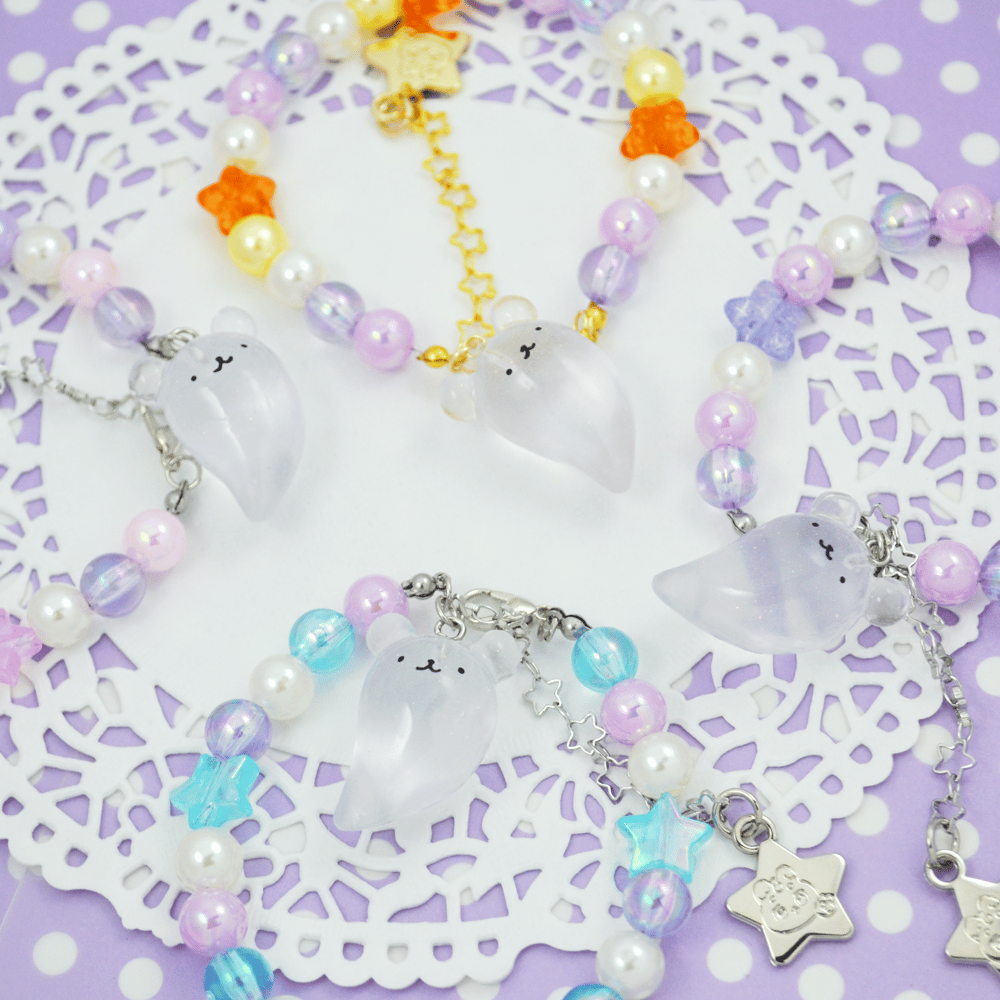 A transparent ghost bear on a pastel beaded bracelet~ Each ghost bear has glitter inside and has a gentle glow in the dark. They are hand-painted so each face will slightly vary.