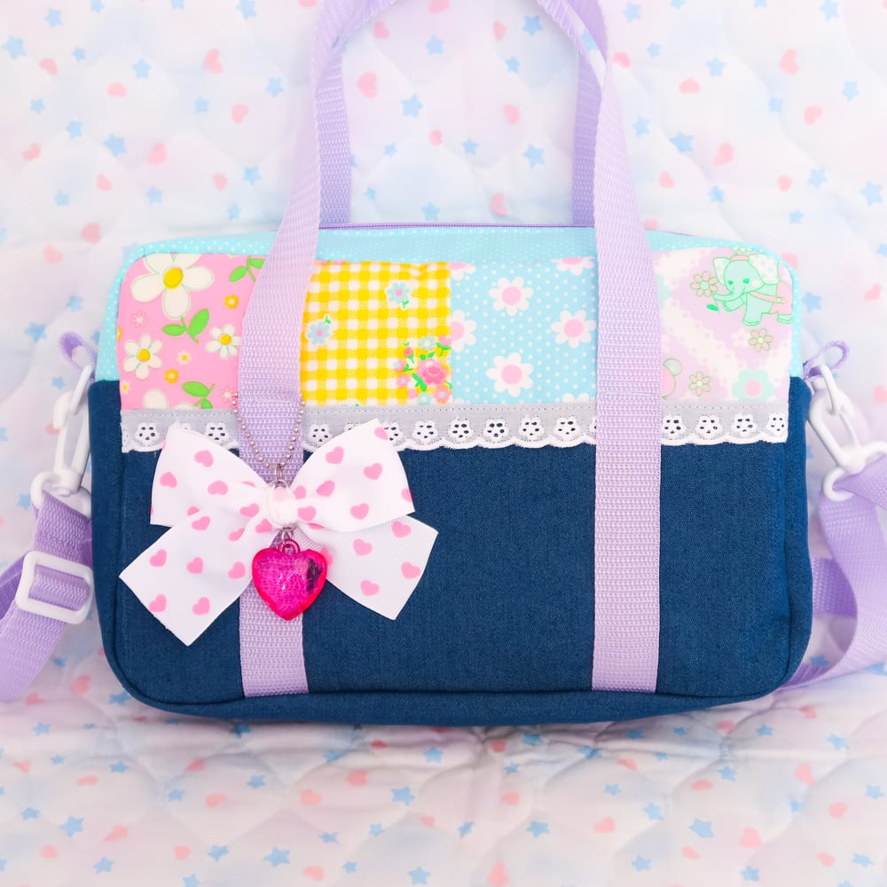 A handle bag featuring quilted fabric and floral scalloped lace underneath~! This bag also includes a removable shoulder strap and bow keychain~
