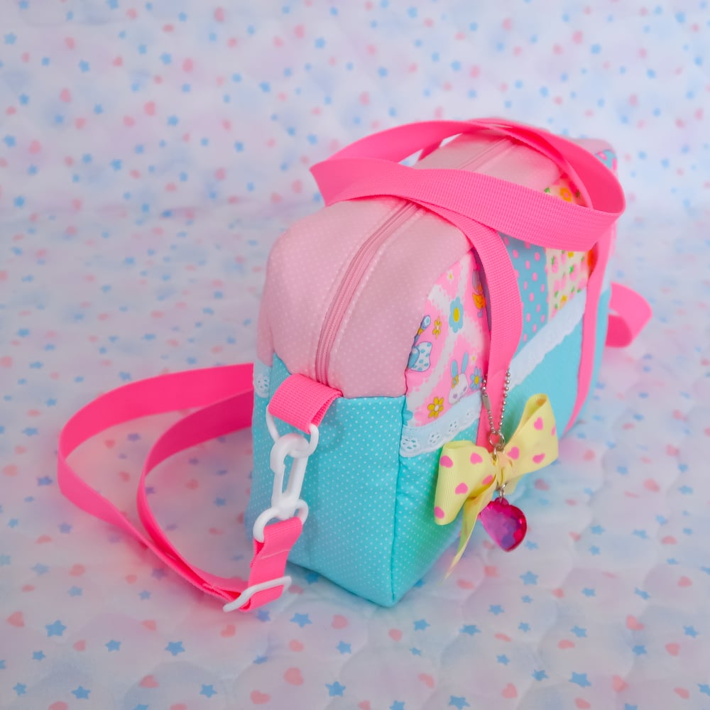 A handle bag featuring quilted fabric and floral scalloped lace underneath~! This bag also includes a removable shoulder strap and bow keychain~