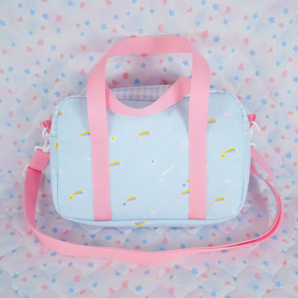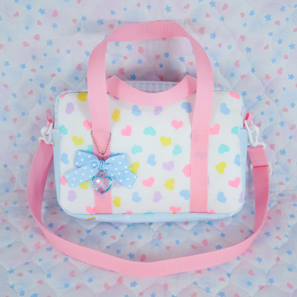 A handle bag featuring a vintage rainbow heart fabric and other fabrics to compliment it~! This bag also includes a removable shoulder strap and bow keychain~