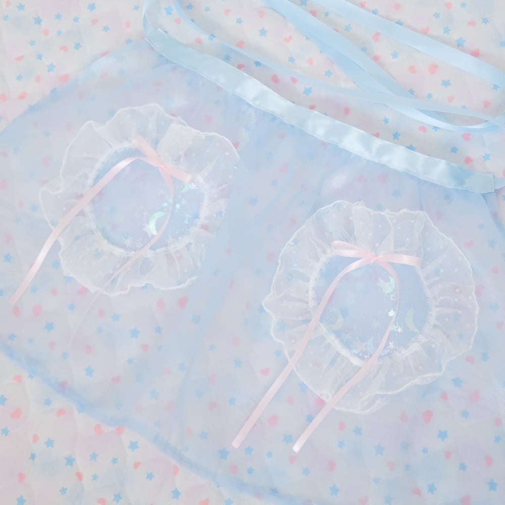 A sheer ruffled apron with heart-shaped pockets~! Each pocket has lace around the edges with a bow on top~!