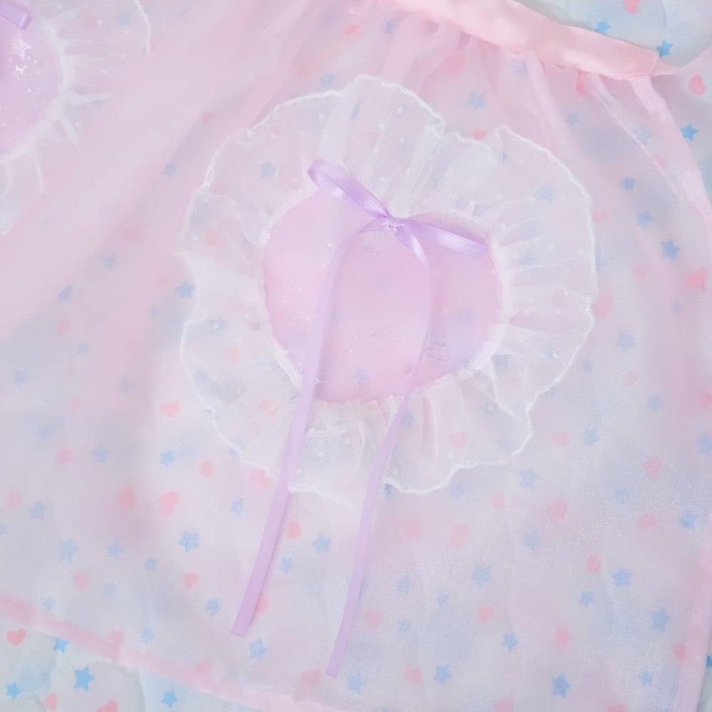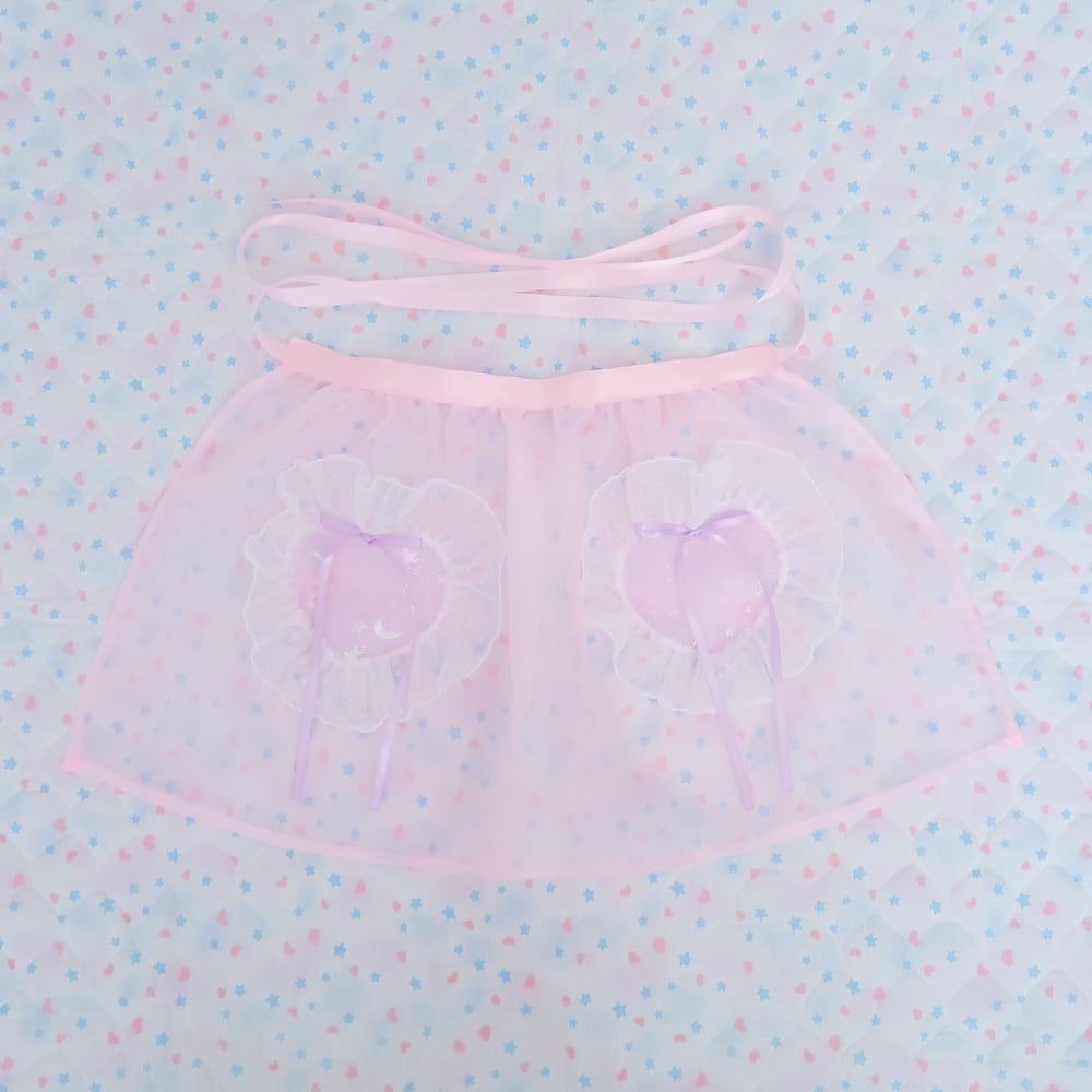 A sheer ruffled apron with heart-shaped pockets~! Each pocket has lace around the edges with a bow on top~!