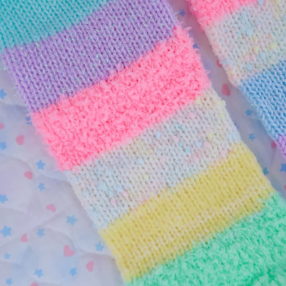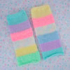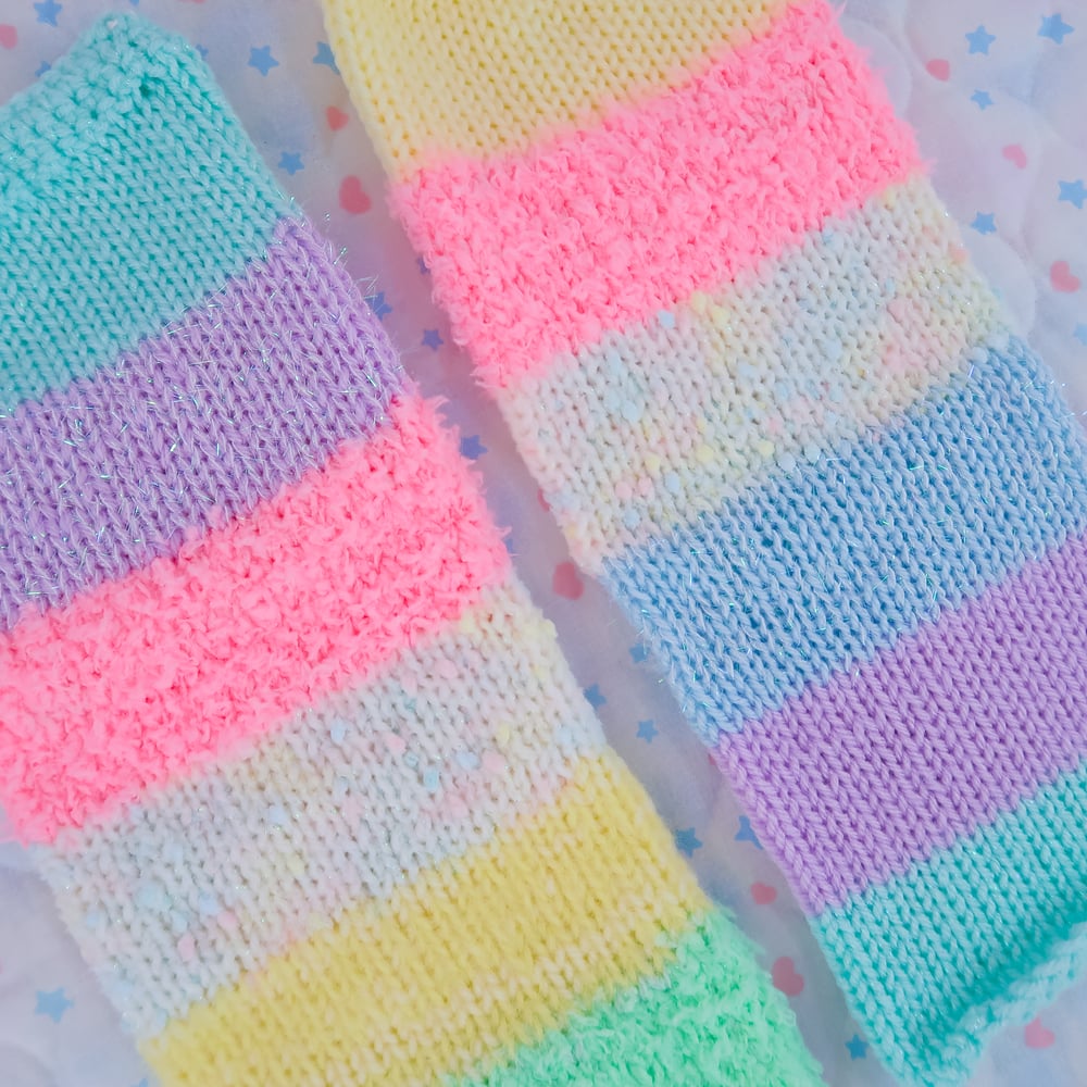 A knitted set of leg warmers featuring different kinds of yarns and textures~ The top of the leg warmers have elastic woven in to help keep them up~