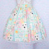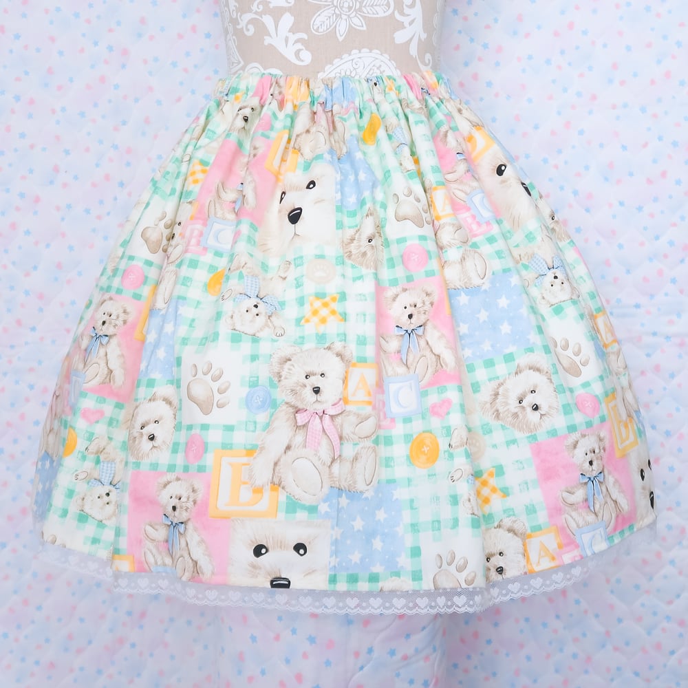 This skirt features a pattern of teddy bears, buttons, and shapes on a green gingham background~ The skirt has elastic around the backside of the waist for comfort and fit~