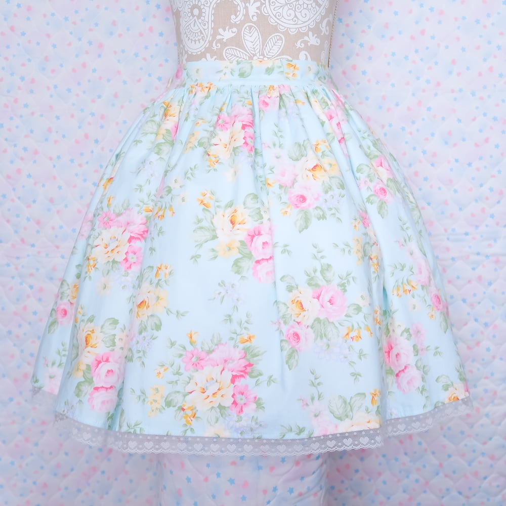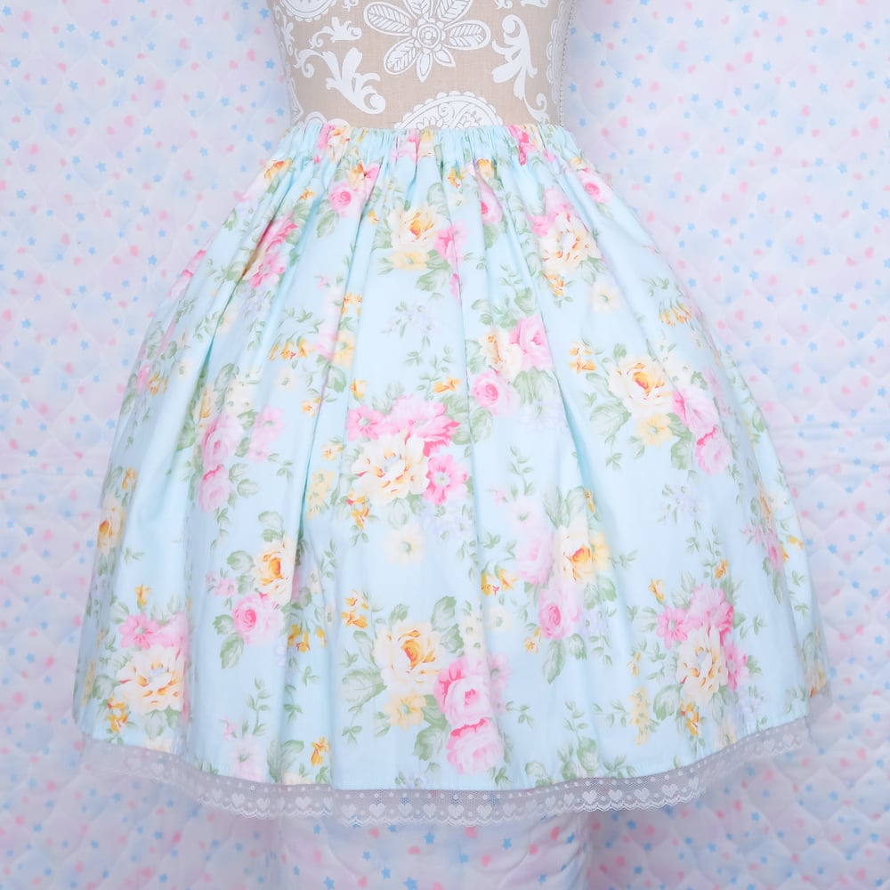 This skirt features a pattern of pink, yellow, and periwinkle flowers on a light blue background~ The skirt has elastic around the backside of the waist for comfort and fit~