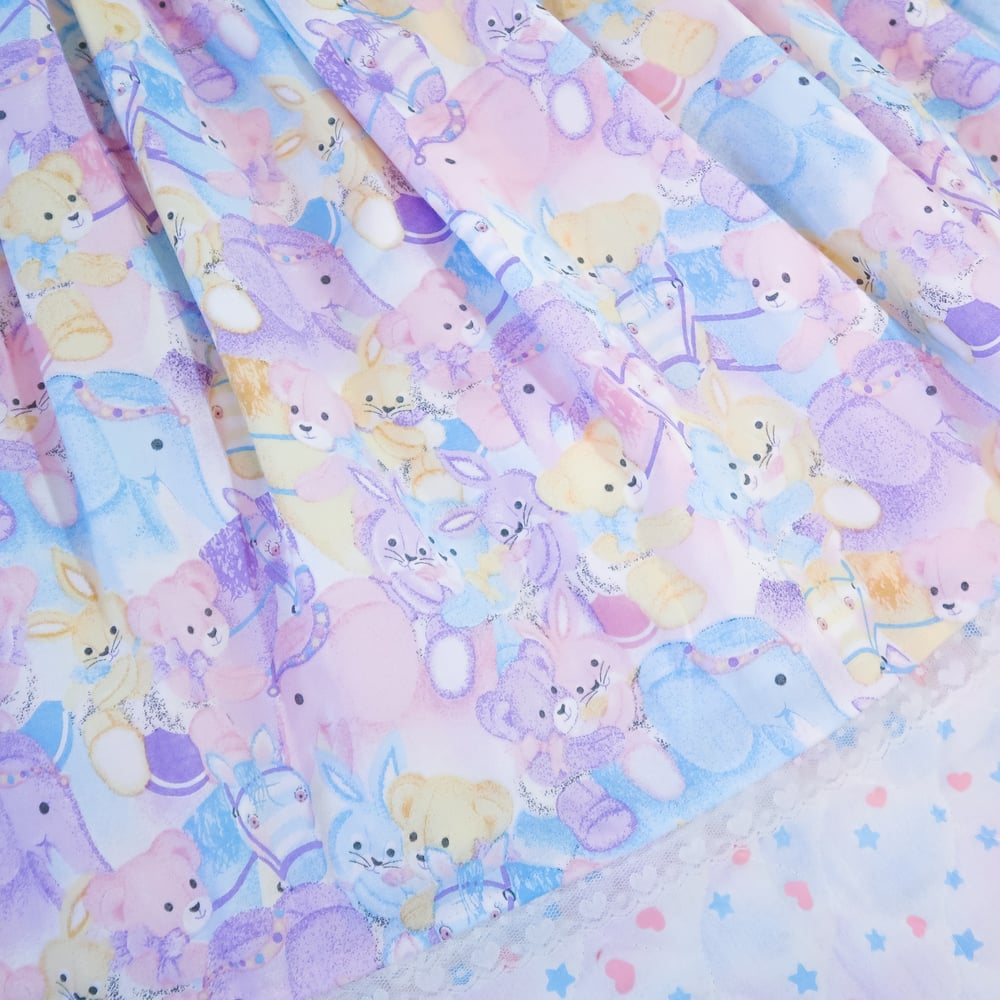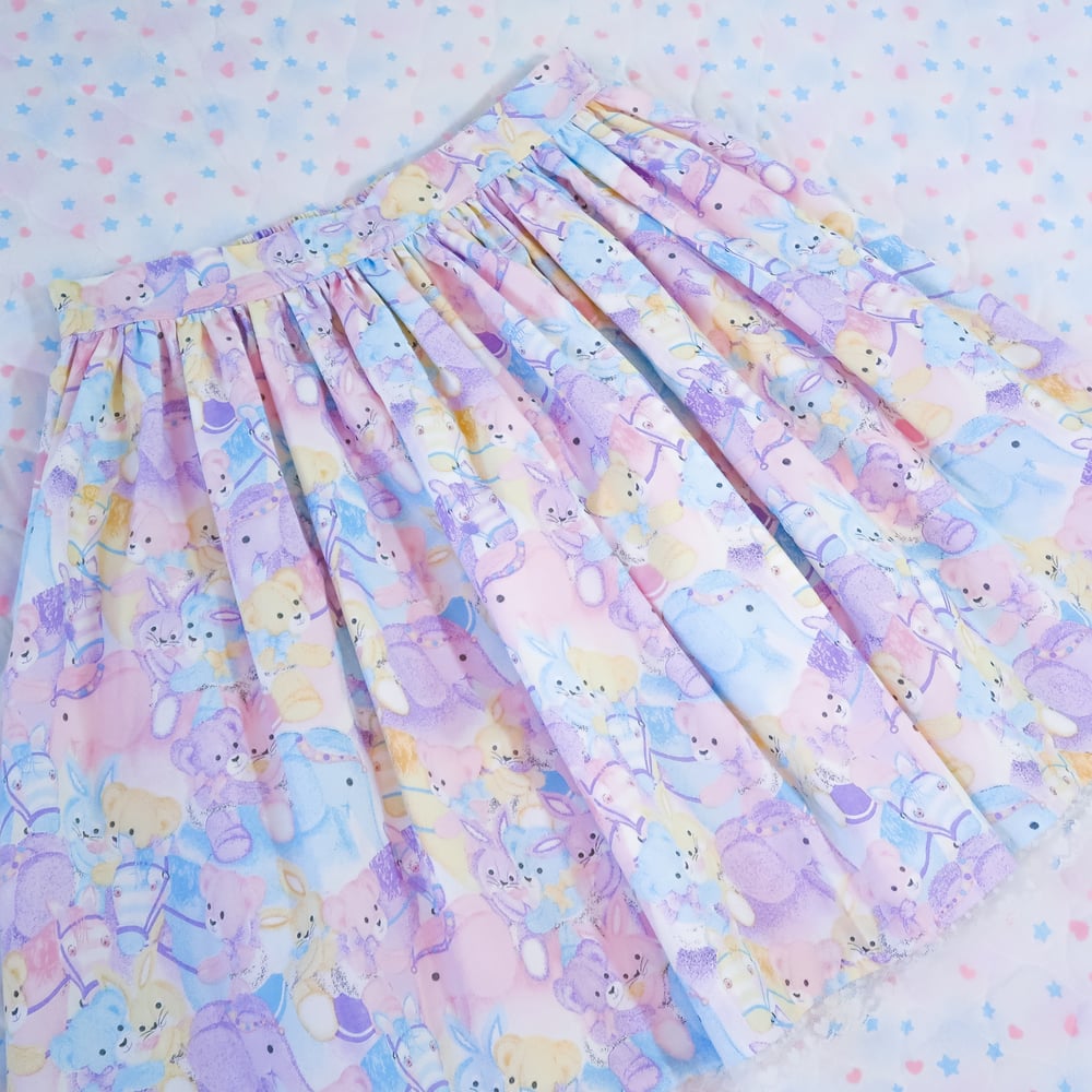 This skirt features a pattern of pastel colored stuffed animals~ The skirt has elastic around the backside of the waist for comfort and fit~