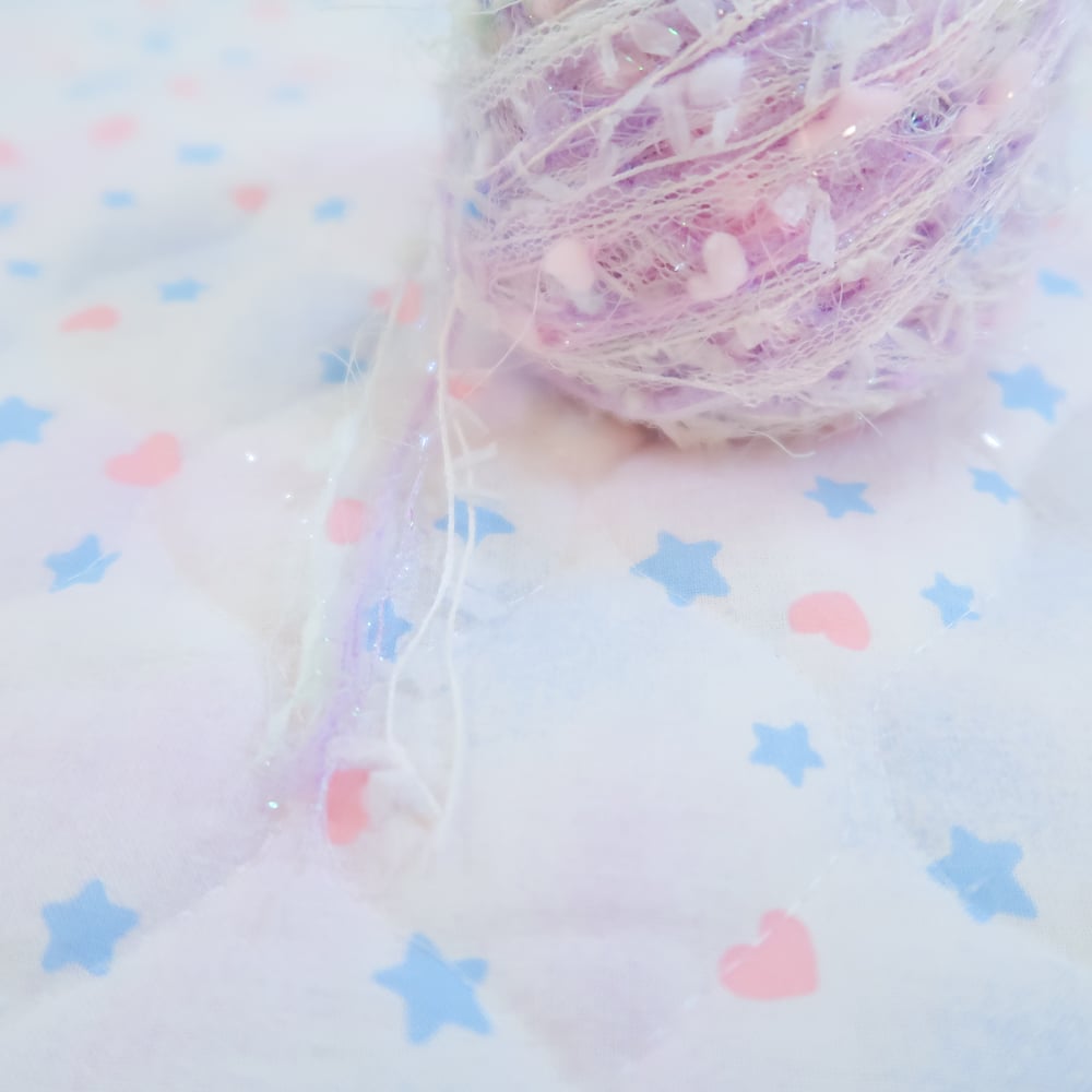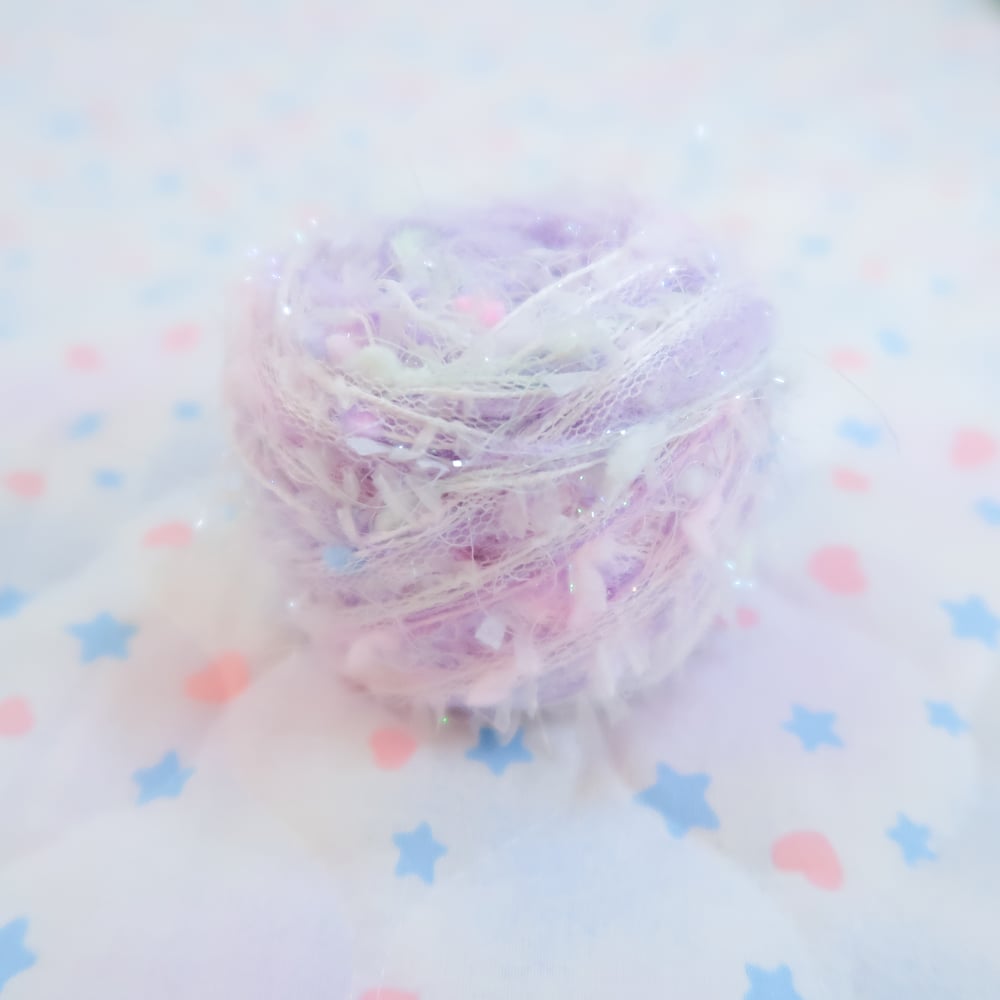 A happy cake of yarn featuring a mixture of different textures and some hand dyed yarn!