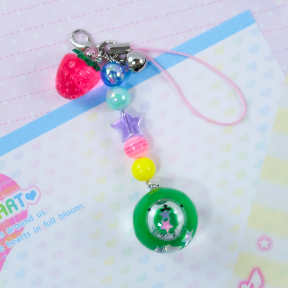 A happy faux marimo charm with glitter~ It also has a bell and phone strap so Moss Friend can travel with you anywhere~