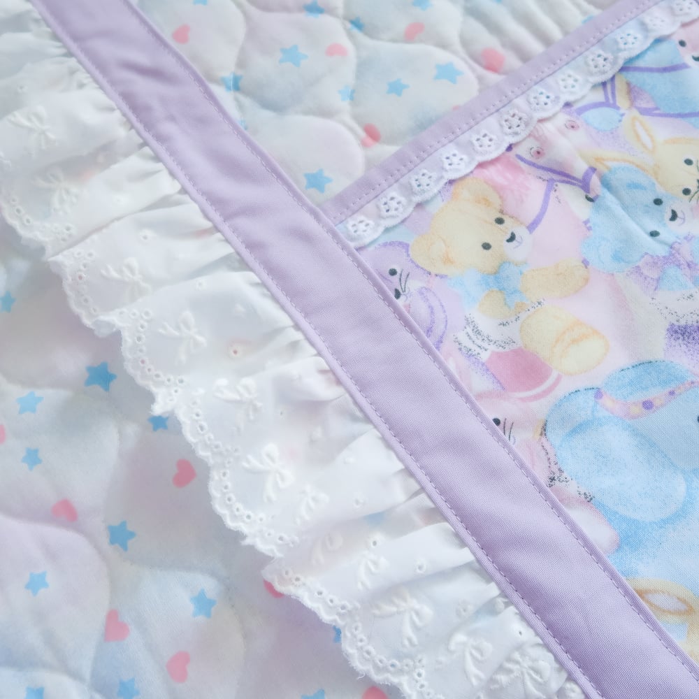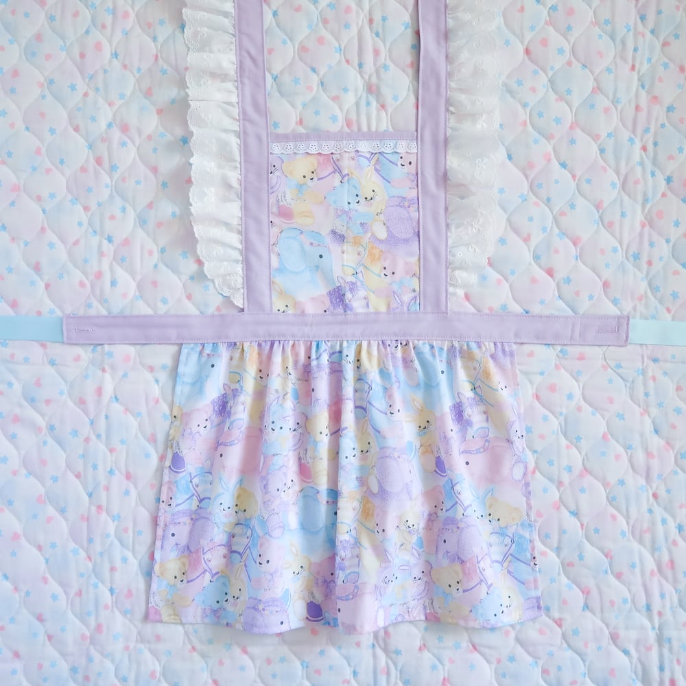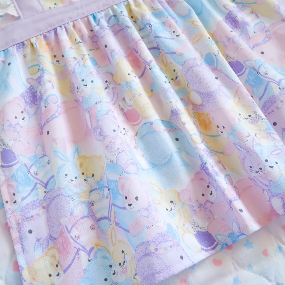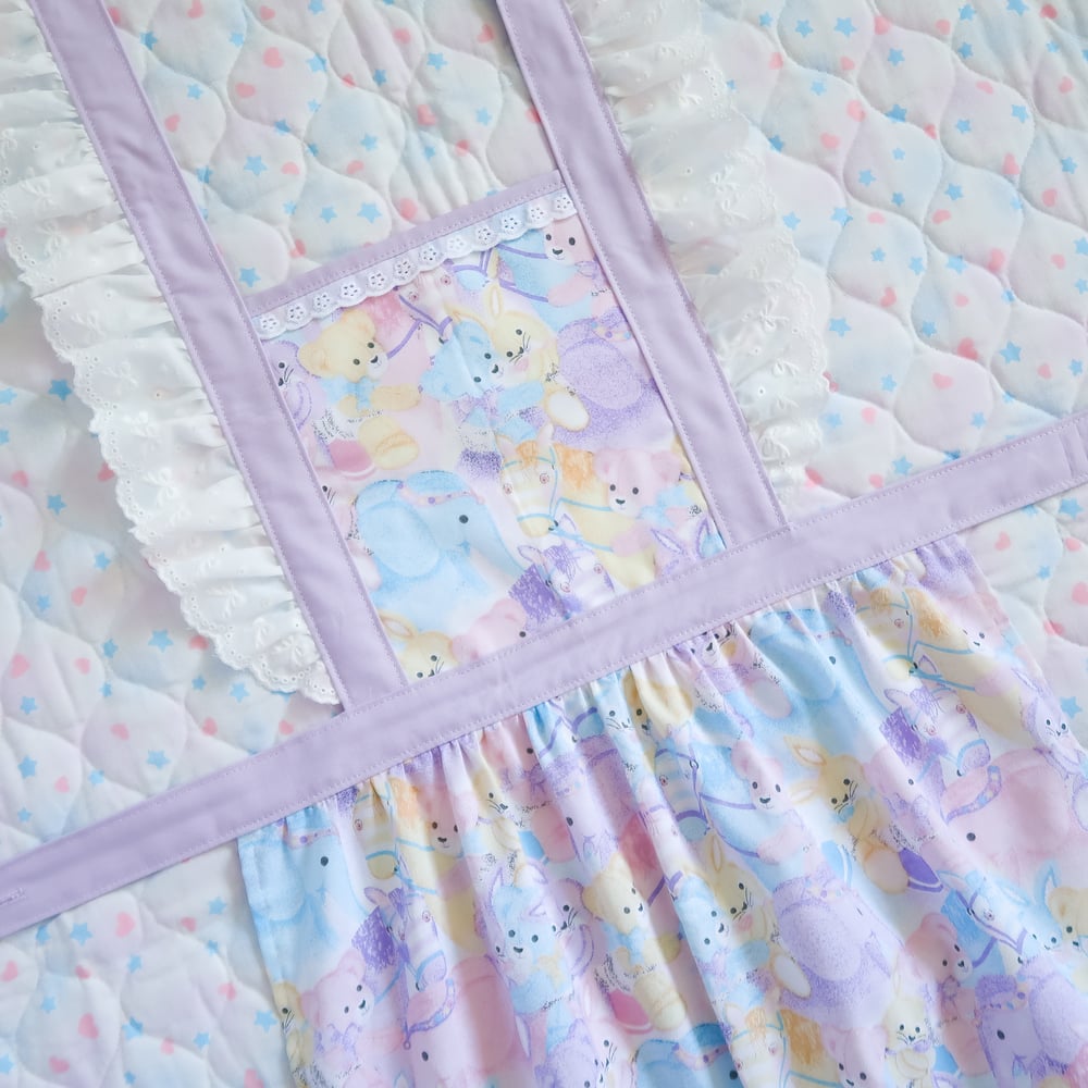 A ruffled apron made from vintage pastel stuffed animal fabric~ This apron features ruffled trim shoulders that can also be adjusted to be longer or be crisscrossed on the backside~