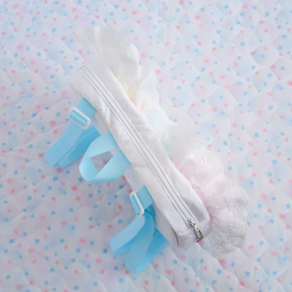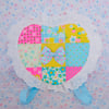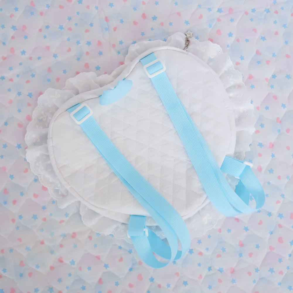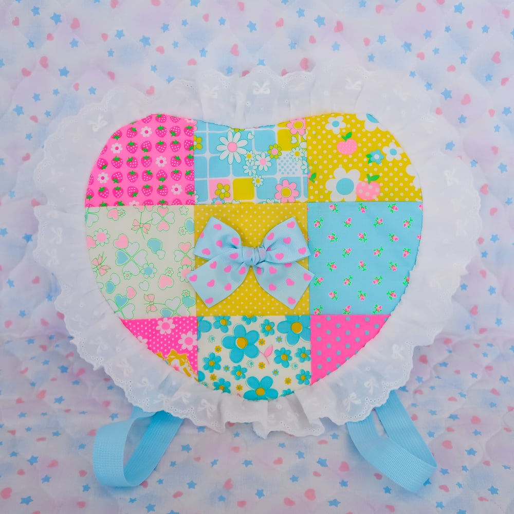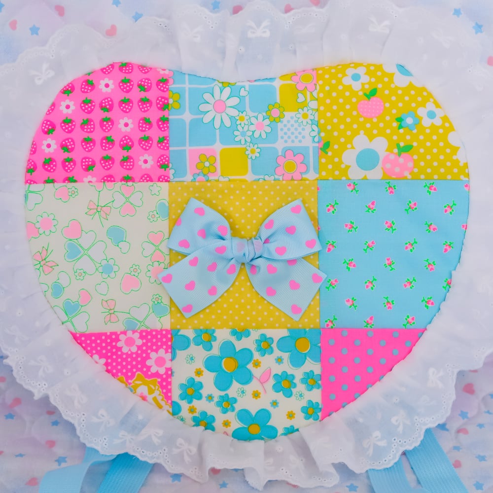 A heart shaped backpack with a heart-patterned bow on the center! Each backpack features a quilted pattern made with a mixture of fabric from both Japan and the US~!