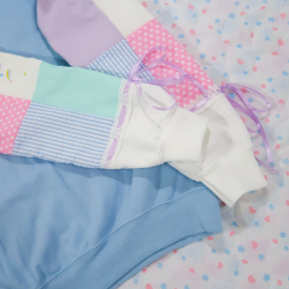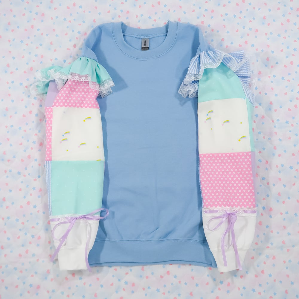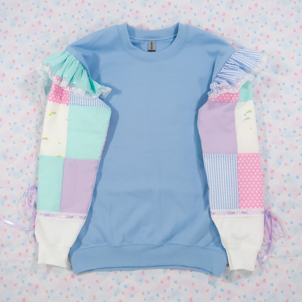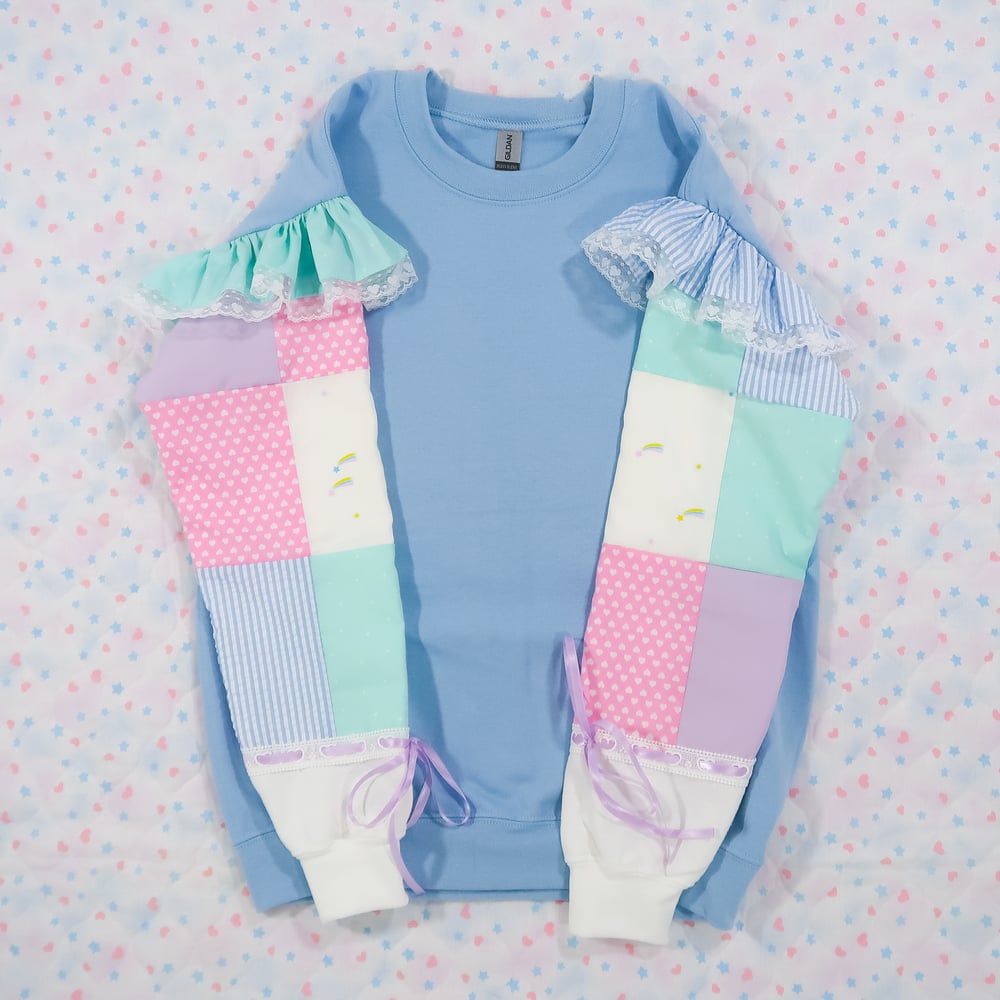 A blue sweatshirt with quilted sleeves and ruffle shoulders~! The bottom of each sleeve has heart lace with lavender ribbon tied into a bow!