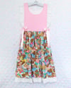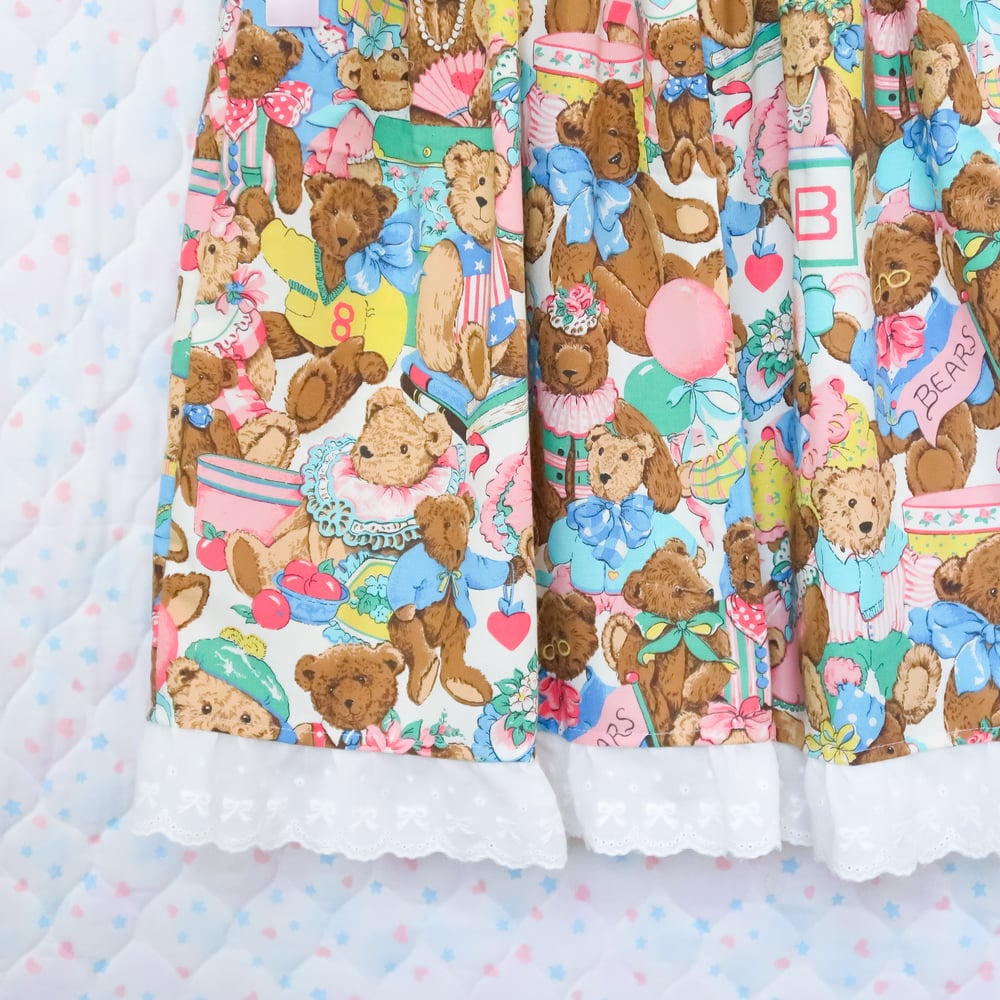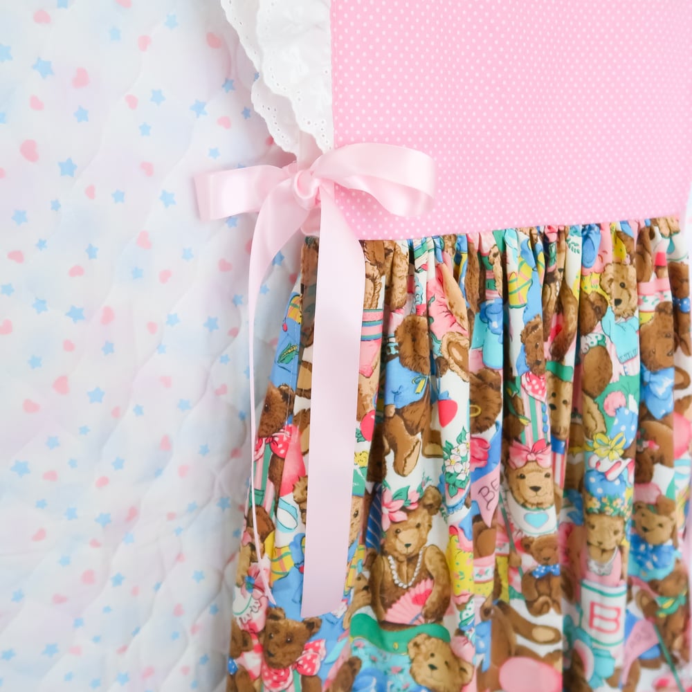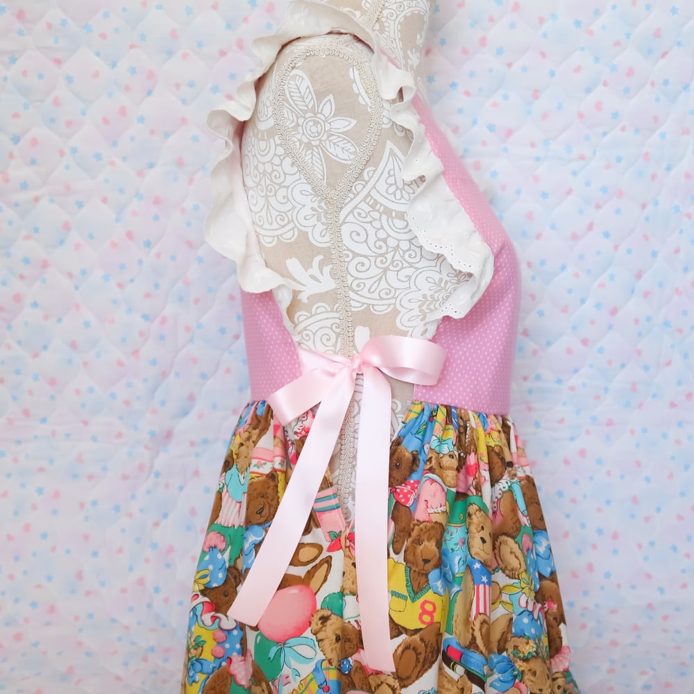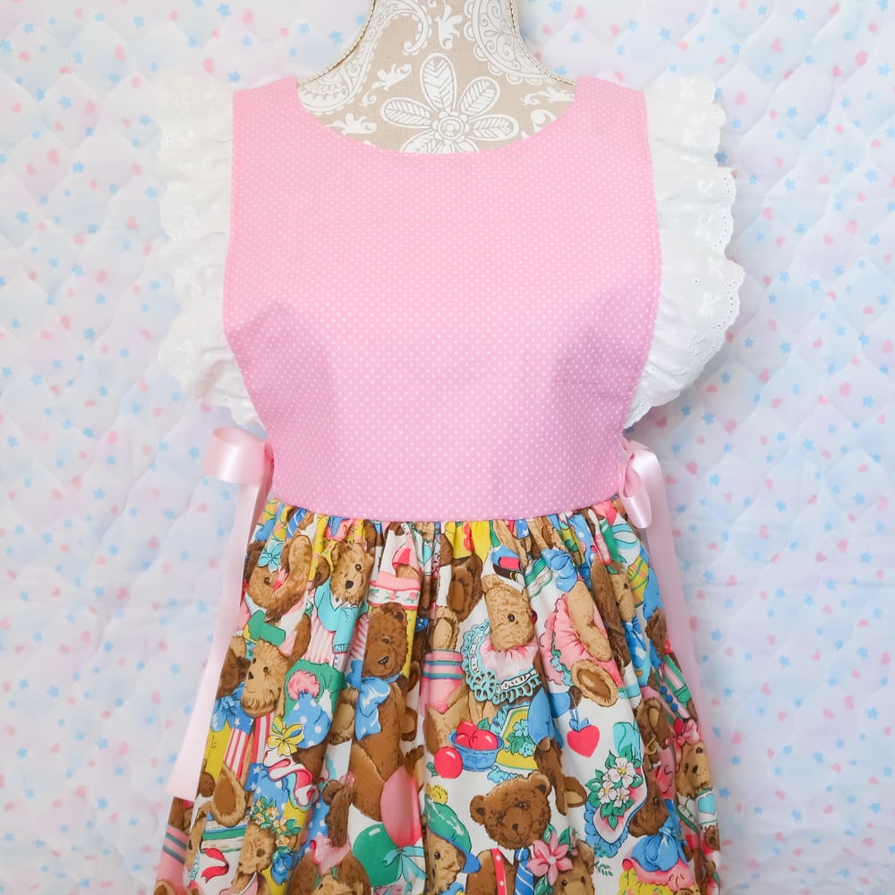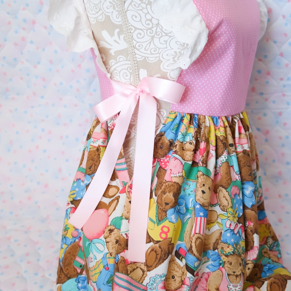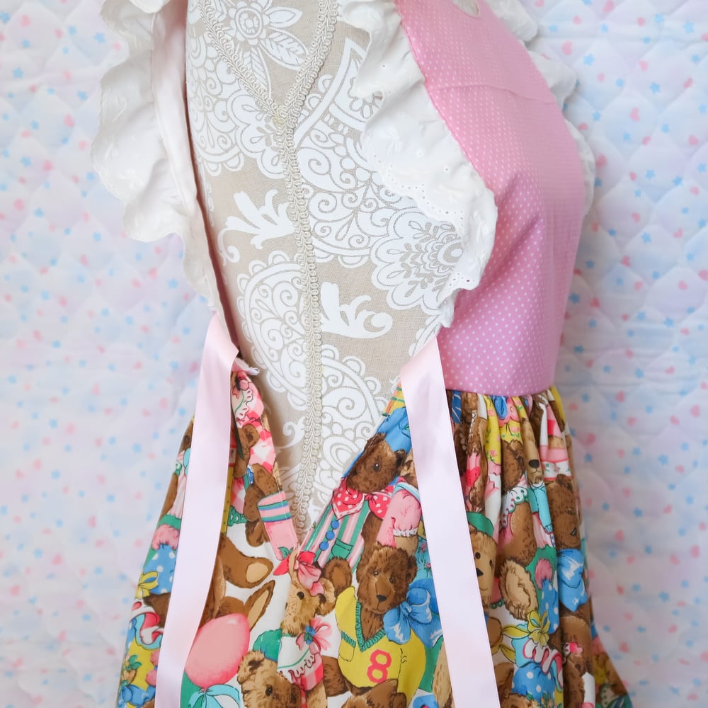 A dress adorned with ruffles on the shoulders and ribbons on the waist for size adjustment~ This dress features a pink and white polka dot pattern and teddy bear pattern~
