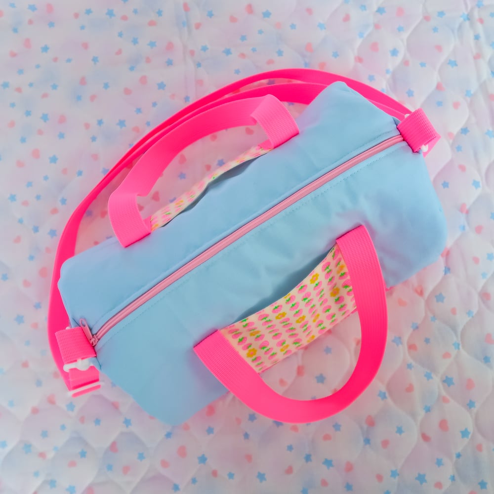A round duffle bag featuring strawberry fabric with other fabrics to compliment it~! Each side of the bag has a pocket on the outside.