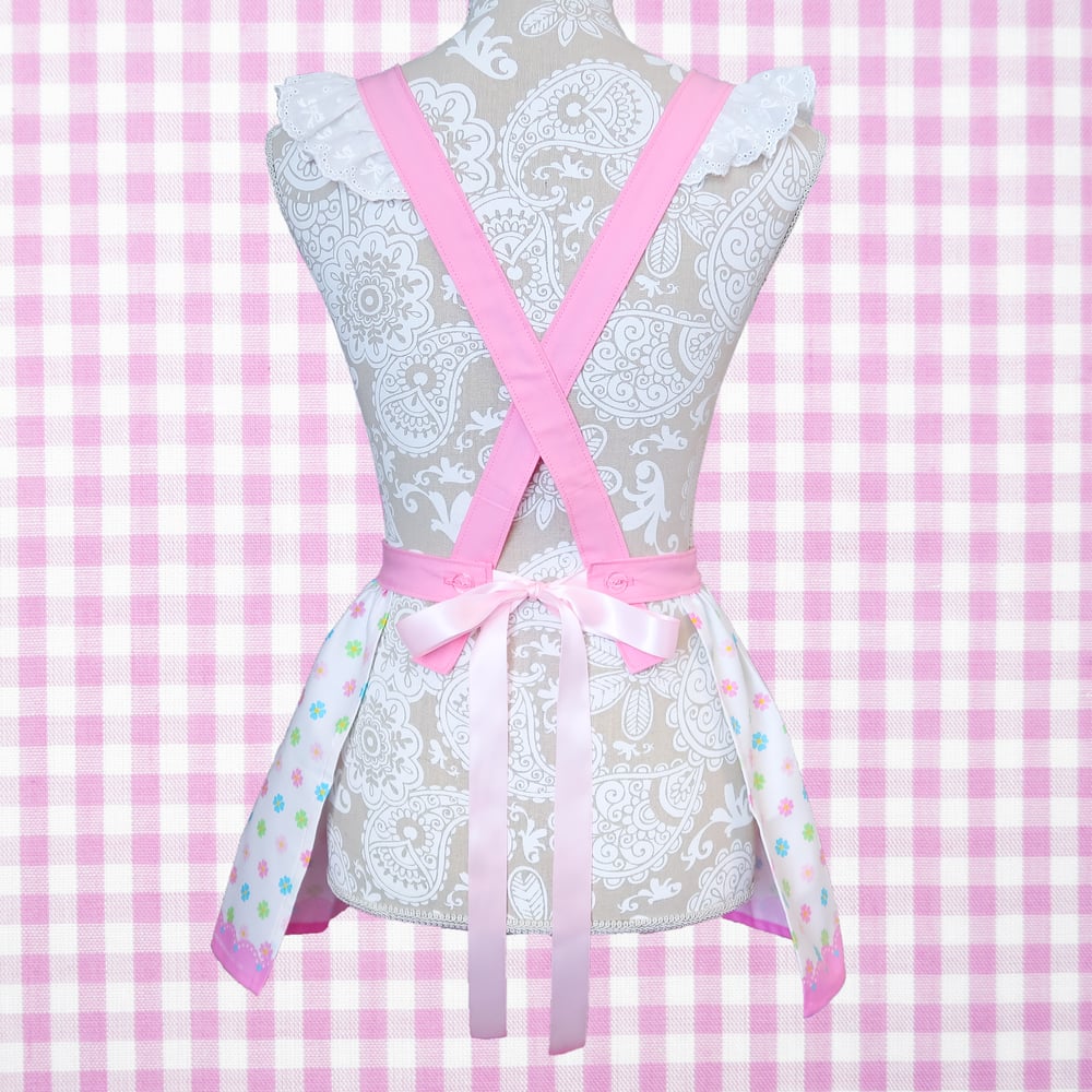 A super sweet apron of Kiki and Lala created by using the materials from a vintage smock apron~ This apron features ruffled trim shoulders and two pockets~ The shoulders can also be adjusted to be longer or be crisscrossed on the backside~