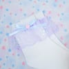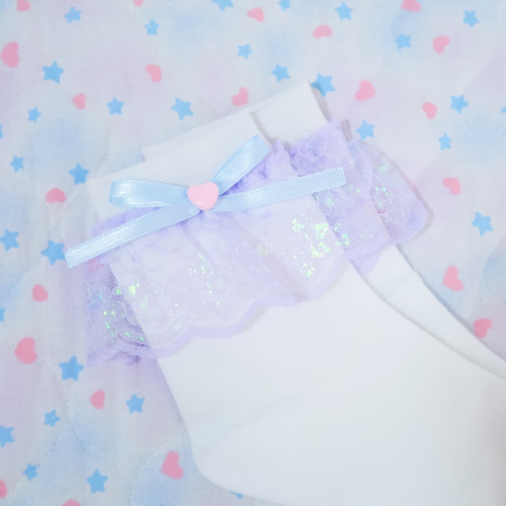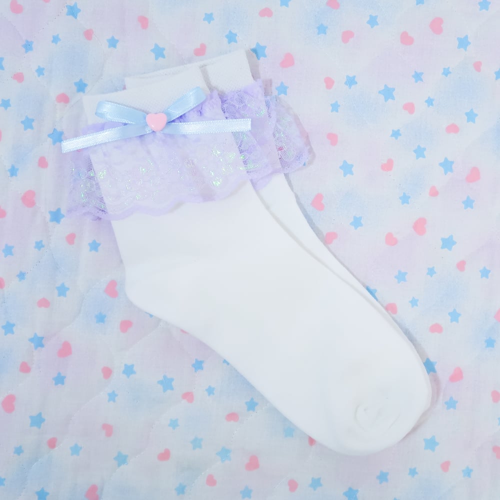 A pair of white socks with iridescent ruffles and a bow on the side of each sock~