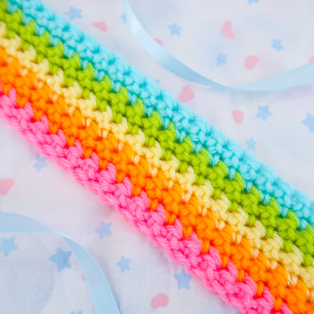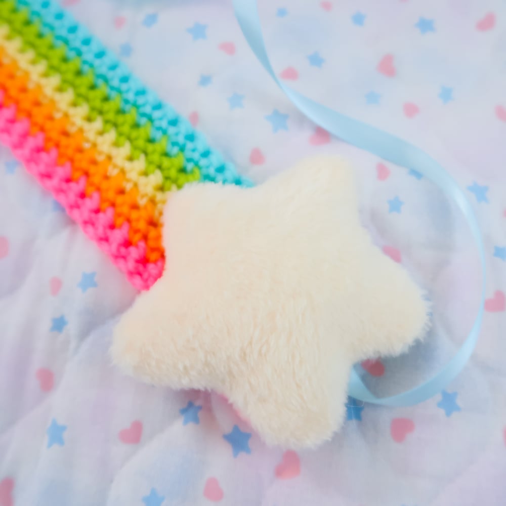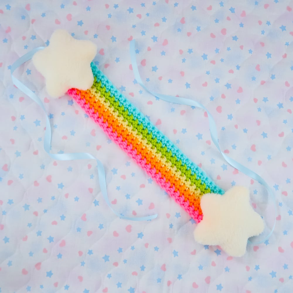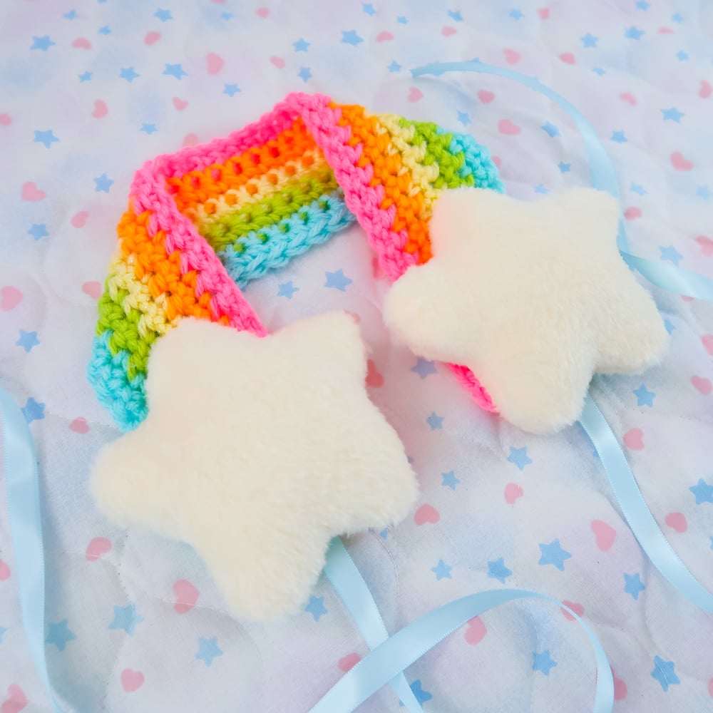 A crocheted rainbow headdress with soft plush stars on each side~ A hint of iridescent accents woven into some of the yarn colors~