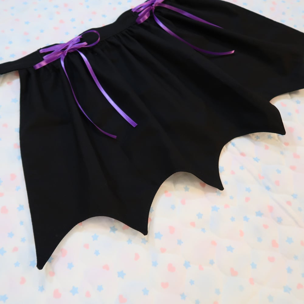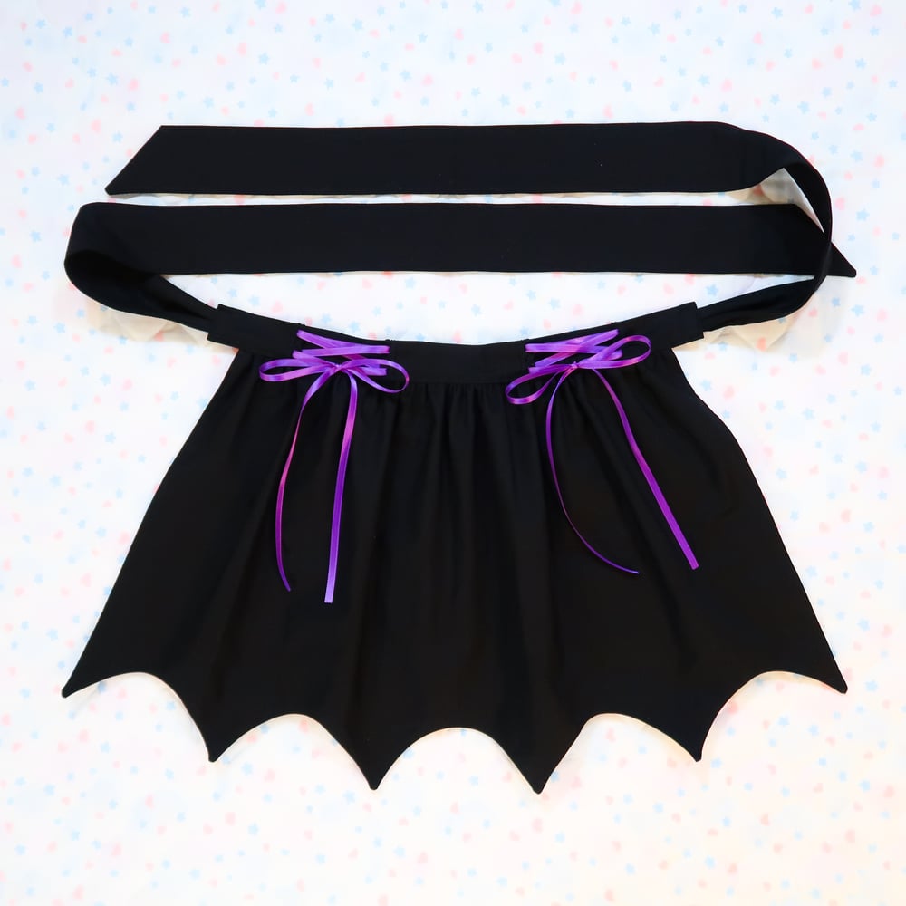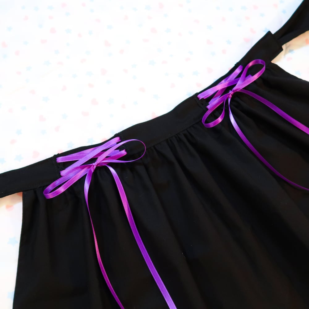 A spooky black apron with satin purple ribbons fed through black lace~ The satin ribbons are removable so they are able to be switched to another color to compliment your coordinate~
