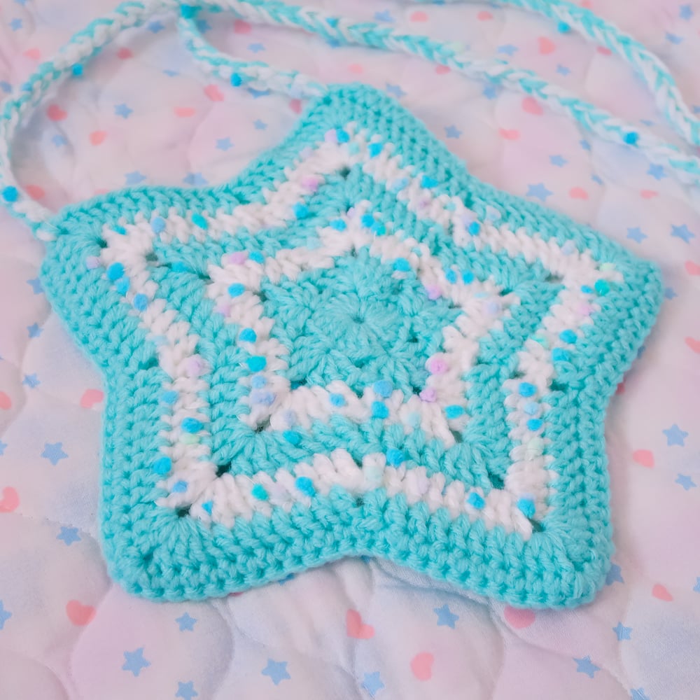 A crocheted star shaped bag~! This bag features multiple types of yarn and hand-dyed pompom yarn to compliment the other colors~!