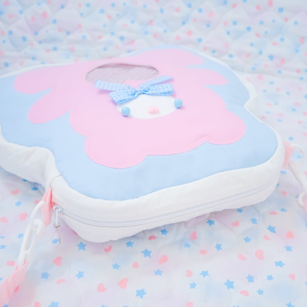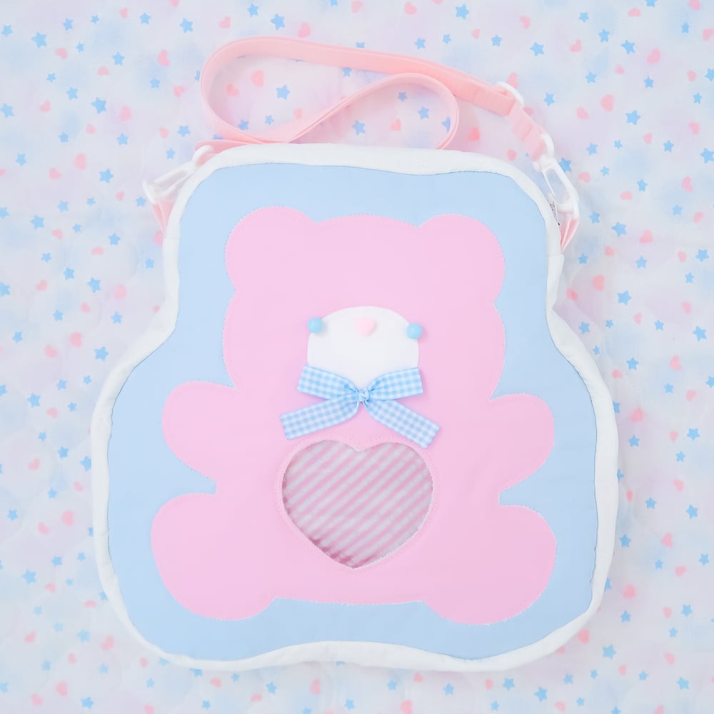 A bear shaped bag with a heart shaped window in the middle~ The window features glitter and a pocket inside the bag to be used like an ita bag. The bear's face and features are hand sewn and embroidered with a ton of love!